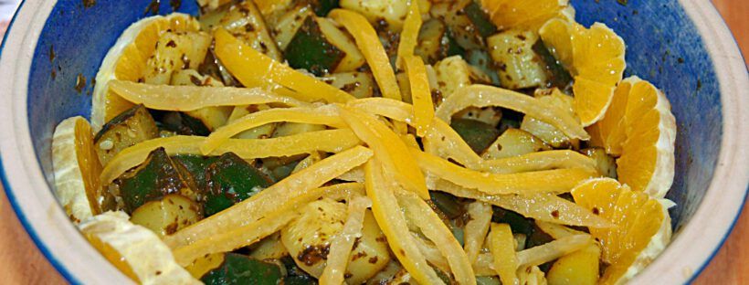Zucchiniwürfel in Salzwasser mit dem Zitronensaft und dem Knoblauch bissfest blanchieren, abtropfen und abkühlen lassen. Aus Koriander, Kumin, etwas Zitronensaft, dem püriertem (zerdrückten) Knoblauch, Pfeffer und Salz mit Olivenöl eine Marinade mischen und die Zucchiniwürfel unterheben. Mit den Zitronenschalenstreifen und den Orangenscheiben garnieren.