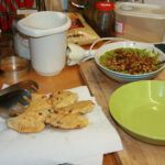 Teig in 25 kleine Kugeln rollen und auf bemehltem Brett zu kleinen Kreisen ausrollen. Teigränder mit Ei bestreichen, etwas Füllung drauf und zusammen klappen. Mit einer Gabel zu Halbmonden zusammen drücken. Jeweils 3,4 Teigtaschen bei ca. 190° goldbraun frittieren. Bis zum Servieren warm halten. Sie können auch tiefgefroren werden, im Kühlschrank aufbewahrt werden und bei Bedarf im Backofen wieder erhitzt werden.