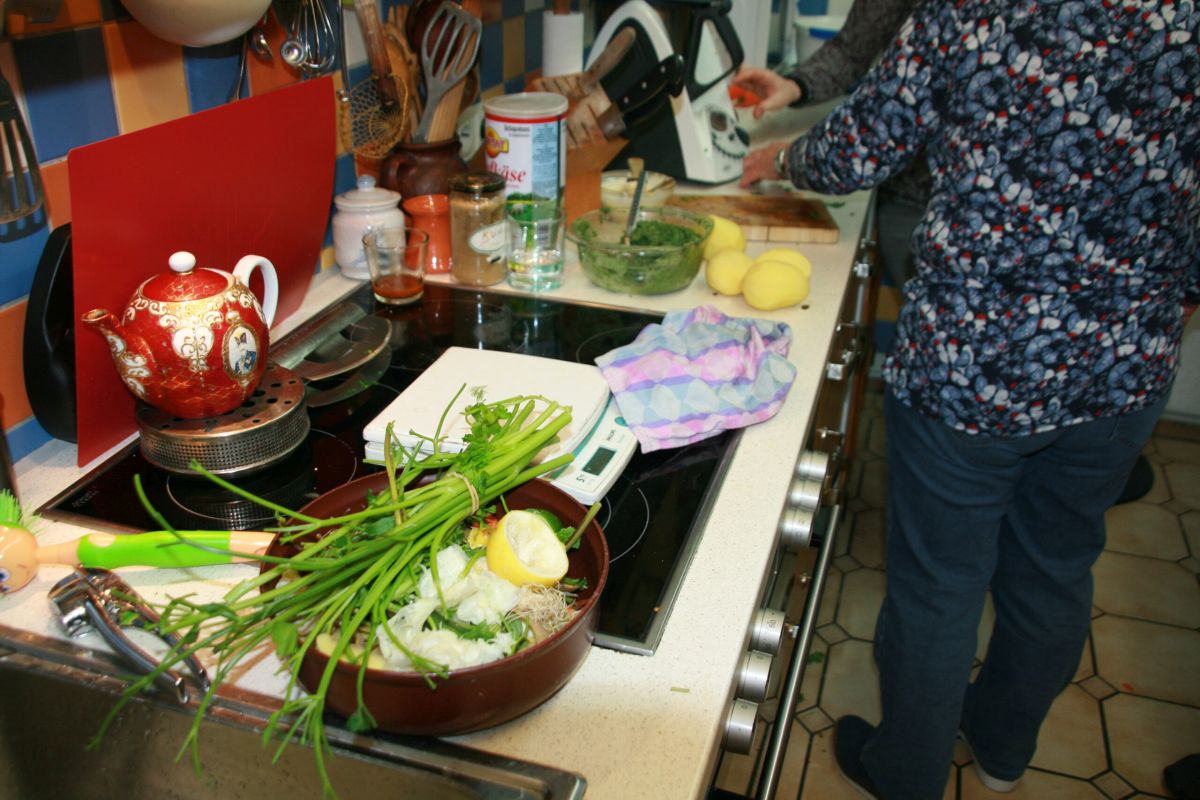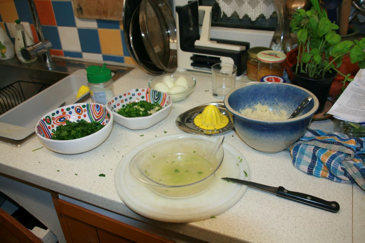 Das Orientalische Büffet oben besteht aus 18 verschiedenen Vorspeisen, gerührt, gebacken, gebraten, gerollt, gekocht, geschnippelt, gefüllt. Hergestellt wurde es im Rahmen eines Kochkurses mit dem Überschriftsthema. Dauer: Gute 3 Stunden mit 7 Personen. Gereicht hätte es aber für 20-25 Personen.