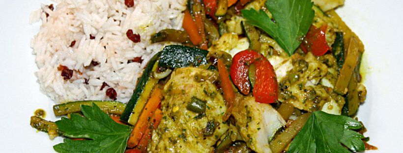 Öl im Wok oder in einer hohen Pfanne erhitzen, Gemüse 2-3 Minuten andünsten, mit Currypulver bestäuben, mit Salz und Pfeffer würzen. Gewürzfonds zugießen und 3-5 Minuten garen, Fisch vorsichtig unterheben und weitere 3 Minuten garen. Mit dem restlichen Koriander / Petersilie dekorieren.