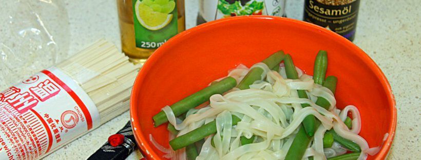Einen kleinen Topf mit Wasser und etwas Salz zum Kochen bringen. Nudeln und geputzte Bohnen gleichzeitig hineinlegen. Ca. 5 Minuten kochen, bis die Nudeln weich und Bohnen bißfest, aber gar sind.