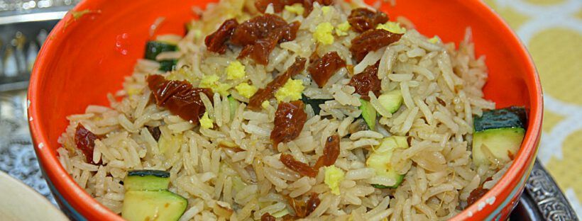 Nochmal 1 TL Ghee erhitzen, die Zwiebel darin anbräunen, Reis hinzufügen, etwas andünsten. Mit dem Wasser ablöschen, Salz zugeben und zugedeckt ca. 10 Min auf kleinster Flamme quellen lassen. Zucchinistücke unterheben, mit Tomaten und Ingwer bestreuen.
