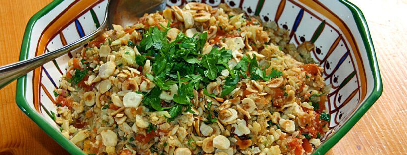 Tomaten und Kräuter unter den Blumenkohl mischen. Mit Haselnussblättchen bestreuen. Den Joghurt dazu servieren.