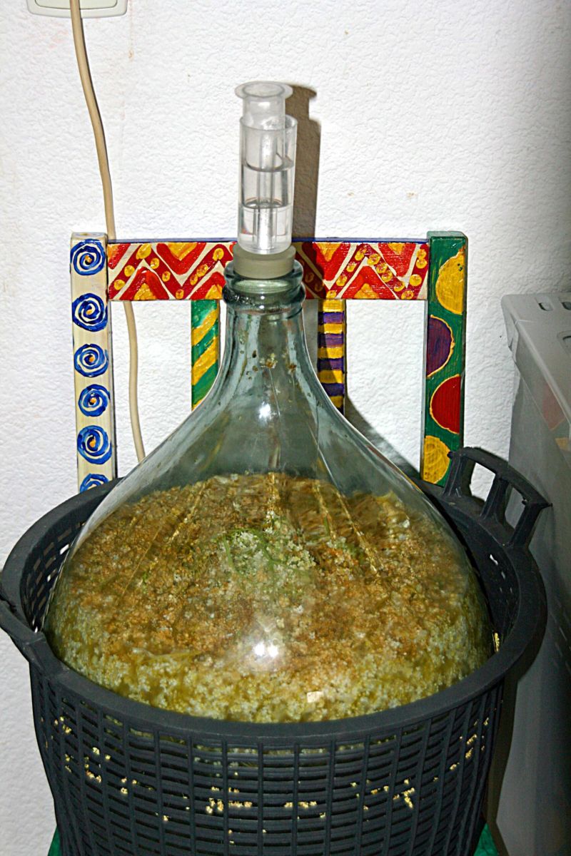 Die Holunderblüten von den Stielen abschneiden, in kaltem Wasser schwenken oder abbrausen und in einem Sieb abtropfen lassen. Den Zucker in warmen Wasser auflösen. Erst das lauwarme Wasser in den Ballon füllen, 2-3 Liter zurückbehalten für die Zuckerlösung. Dieses Wasser erhitzen. Den Zucker und die Zitronensäure darin auflösen. Erkalten lassen. Die kalte Zuckerlösung in den Ballon füllen, ebenso die kalten Blüten (nicht überbrühen!). Das in wenig lauwarmen Wasser gelöste Hefenährsalz der Maische zusetzen. Den Ballon kurz durchschwenken. Gärverschluss mit Wasser füllen und aufsetzen. Am besten bei Zimmertemperatur stehen lassen.