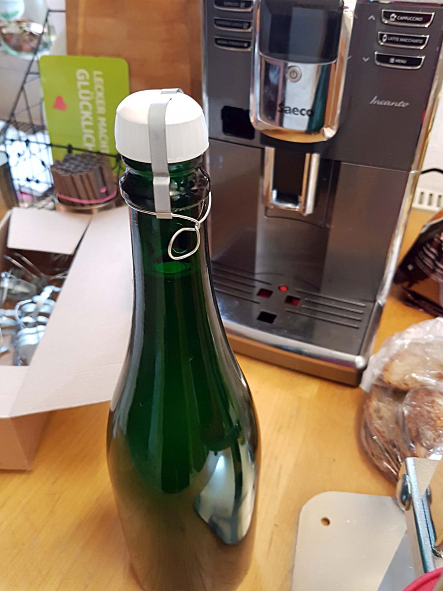 Die Korken müssen unbedingt mit Sektverschlüssen gesichert werden – sonst fliegen sie bei dem Druck heraus.