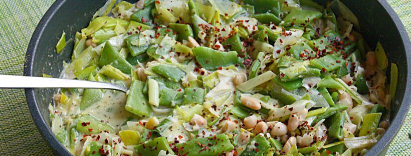 Gewaschenen Lauch und Knoblauch in Öl andünsten (ca 5 Min). Koriander, Bohnenkraut und Salz mischen und unter den Lauch mengen. Abgetropfte und abgeschreckte Bohnen dazu mischen. Mit etwas Gemüsebrühe auffüllen, Schmand dazu rühren, Salzzitrone unterrühren. Abschmecken. Mit Chilipulver und geriebenen Käse bestreuen.