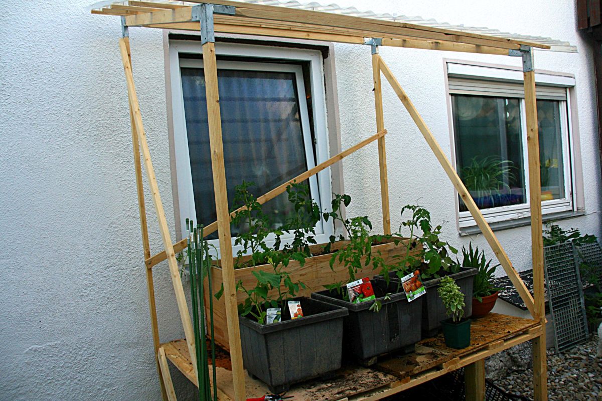Endlich ist mein neues Tomaten-„Haus“ fertig, d.h. ein Gestell mit Dach, auf dem richtig große Töpfe stehen können. Eigentlich wollte ich nur irgendwas vor dem Badezimmerfenster anpflanzen, damit es beschattet ist und die Sonne nicht so ins Bad reinbrennt im Sommer. Leider war das dann gar nicht so einfach, da im Hinterhof mehrere große Felsbrocken herumliegen und ich das Gestell um diese herum konstruieren mußte. Aber wenn schon der Aufwand für den Bau eines Pflanzgestells, dann kann man ja auch gleich Gemüse ziehen…..Zum Beschatten muß es höher wachsen und möglichst ranken, also fiel die Wahl auf Xitomatl, wie der originale Name bei den Mayas lautete.