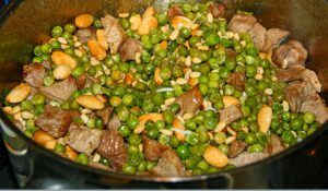 Fleisch in Butterschmalz anbraten. Nach ca 15 Minuten die Erbsen zugeben. Unter Rühren beides weich dünsten. Kräftig salzen sowie 2-3 EL Zucker unterrühren.