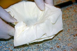 Eine kleine Glasschüssel mit Butterschmalz auspinseln, 3-5 Blätter Yufkateig zusammenlegen und hineinschichten. Mit dem Reisfleisch füllen. Verschließen und mit der Oberseite nach unten in eine Bratreine legen.