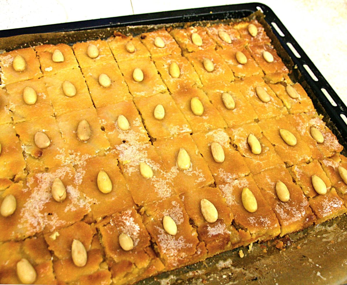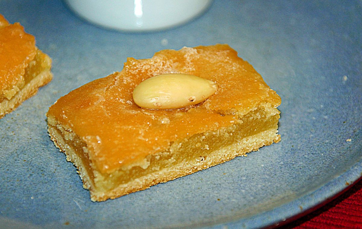 Den heißen Kuchen mit Glasur bestreichen und in Stücke schneiden. Sofort jeweils eine Mandel darauf setzen.