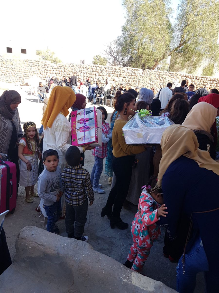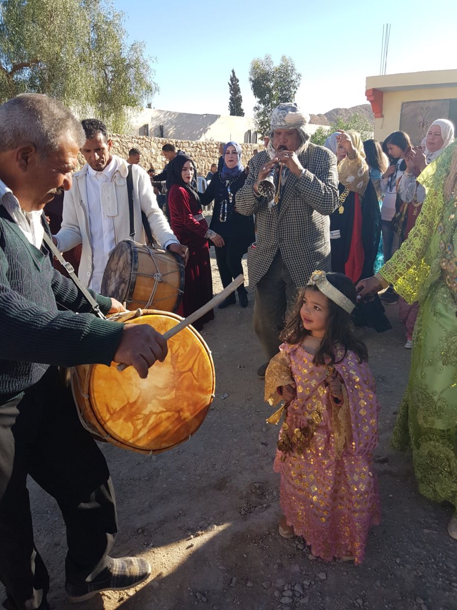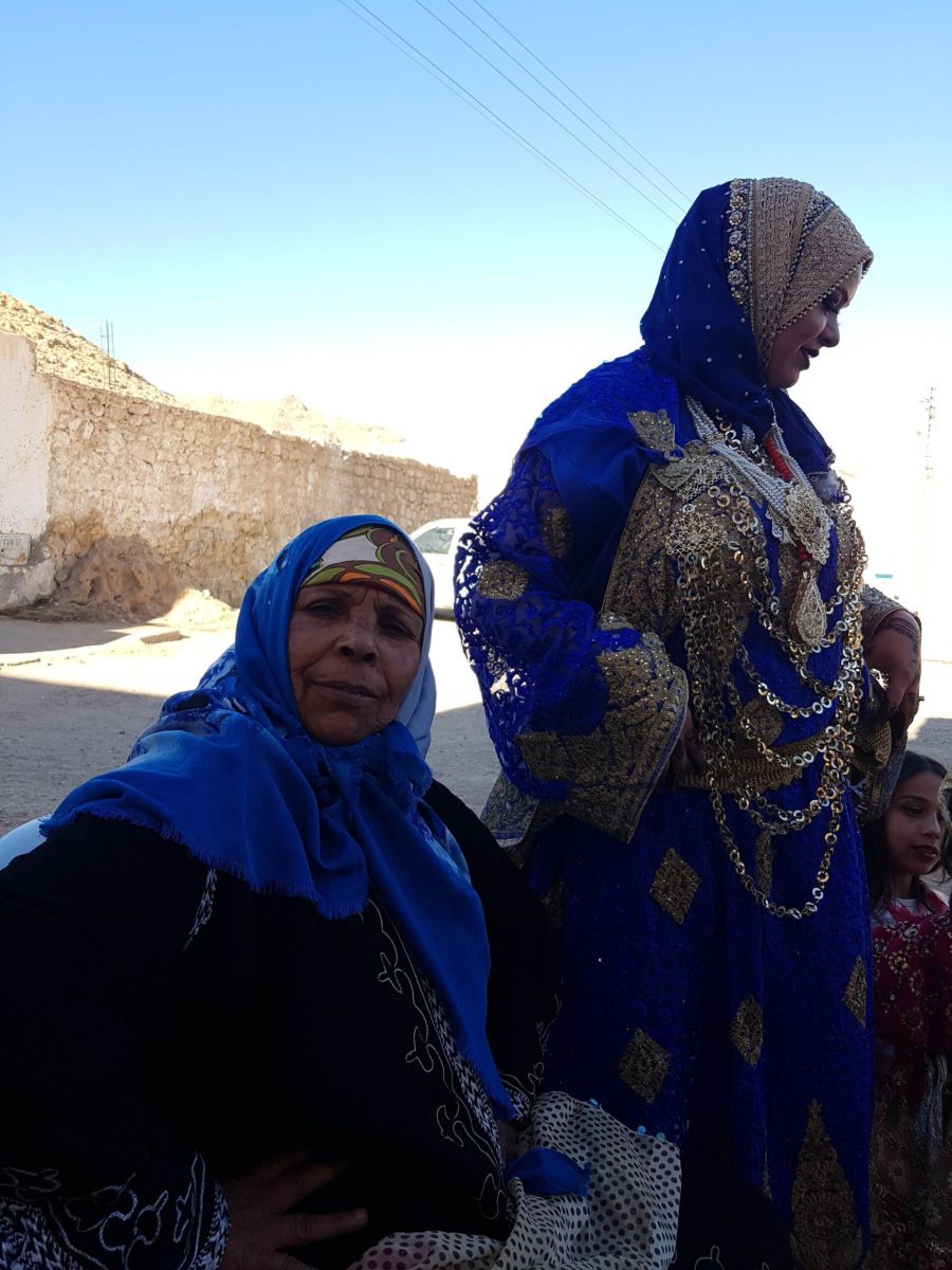 Es war der erste Tag der Hochzeit, an dem das Heiratsdokument unterzeichnet wird. Von der Hauptstraße aus, wo alle geparkt hatten, zog man mit den obligatorischen drei Musikern zum Platz vor dem Haus. Während im Haus die Braut von den Frauen die Segenswünsche, Küsse und Geschenke entgegennimmt, wird draußen der Tisch aufgebaut. Auch ich reihe mich ein, küsse die mir unbekannte Braut auf beide Wangen und wünschte ihr Alf Mabruk, „tausend Glückwunsch“. Ob ich hier nun ein Wort verstehe oder nicht, spielt keine Rolle: mir bleibt nix anderes übrig, als bei den Frauen zu sitzen. Aber in der Regel haben wir viel Spaß, auch ohne große Sprachkenntnisse. Englisch kann hier kaum jemand und ich kein Französisch.