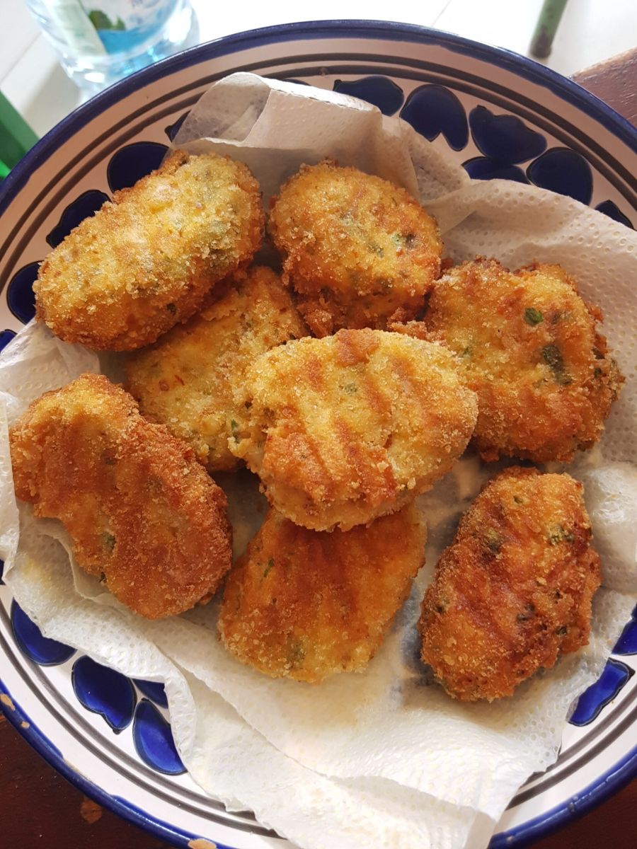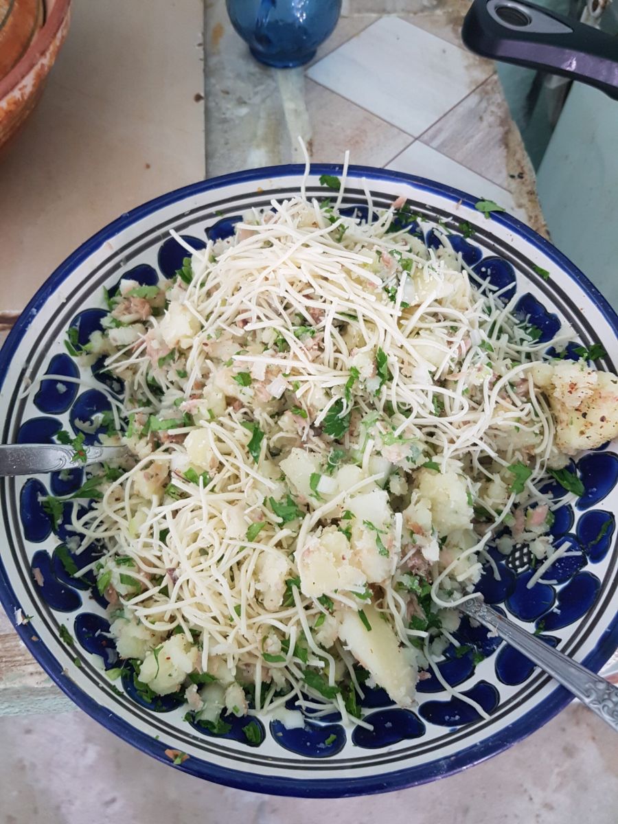 Dazu passen Kartoffelbrik und Baguette. Wenn man keine Malsoukablätter für die Brik hat (ähnlich wie Filoteigblätter), kann man kleine Bratlinge aus der Brikfüllung formen und panieren. Hat mindestens genausoviel Kalorien, da beide Varianten fast schwimmend im Fett ausgebacken werden.