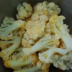 Blumenkohl in große Röschen zerpflücken und in Salzwasser gar kochen. Aufpassen, dass er nicht zu weich wird. Am besten Kurkuma schon ins Kochwasser; hat man es vergessen, dann jetzt darüber stäuben. Ins verquirlte Ei (eventuell leicht gesalzen) tauchen, in Mehl wälzen und in reichlich Öl von allen Seiten goldbraun ausbraten.