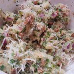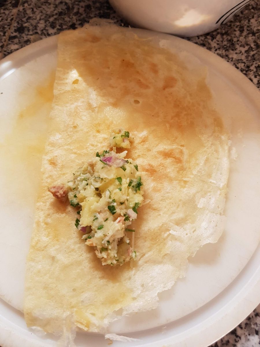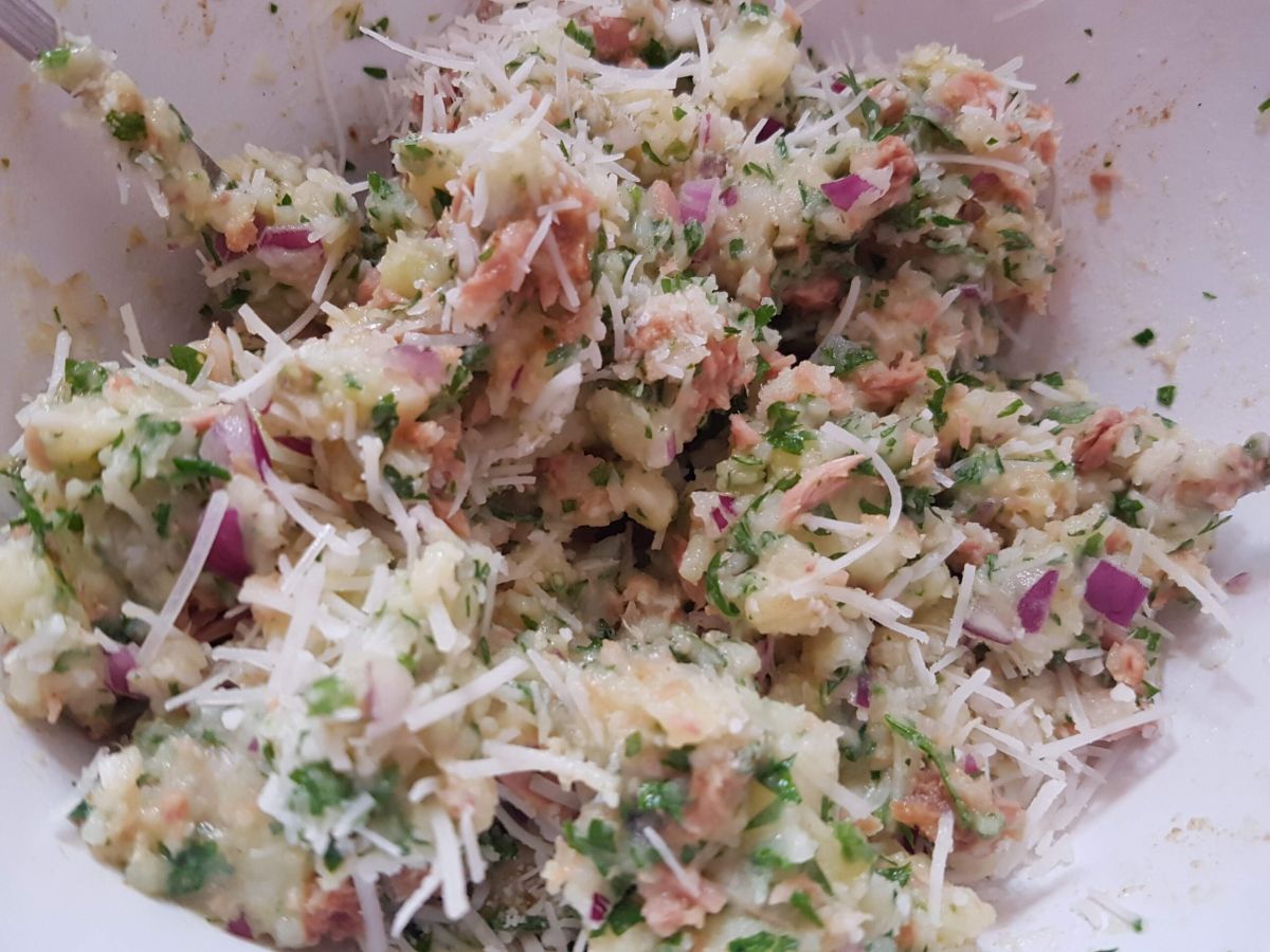 Für die Zwiebelhasser variiere ich die Füllung in keine Zwiebel, nur 1 Kartoffel, dafür 2 gehäufte EL Creme fraiche, der Rest (Petersilie, Thunfisch, Käse, Ei, gehackte Kapern) wie gehabt.