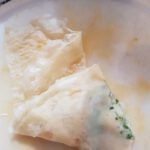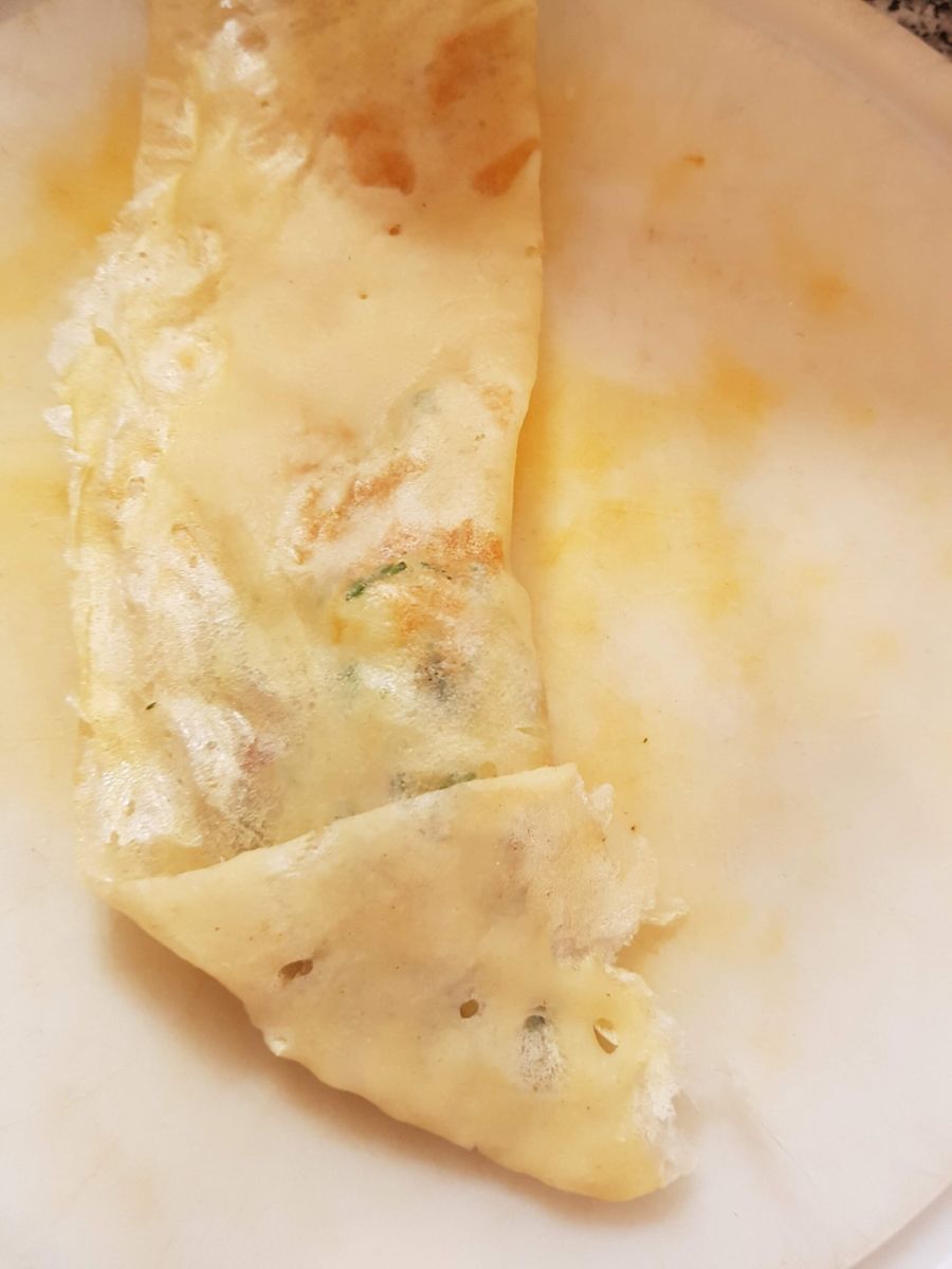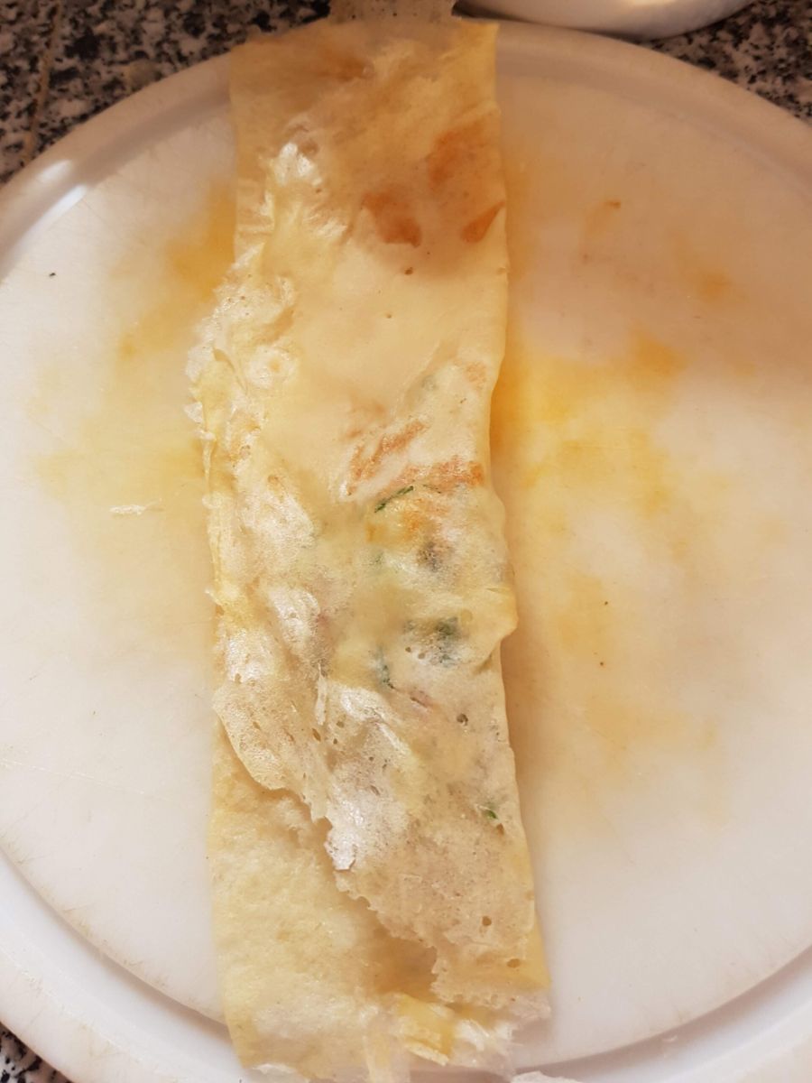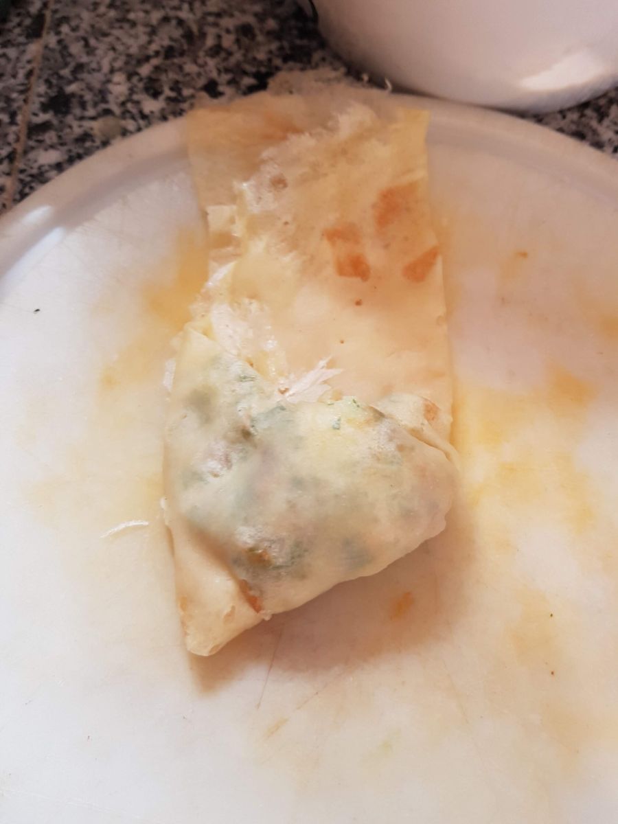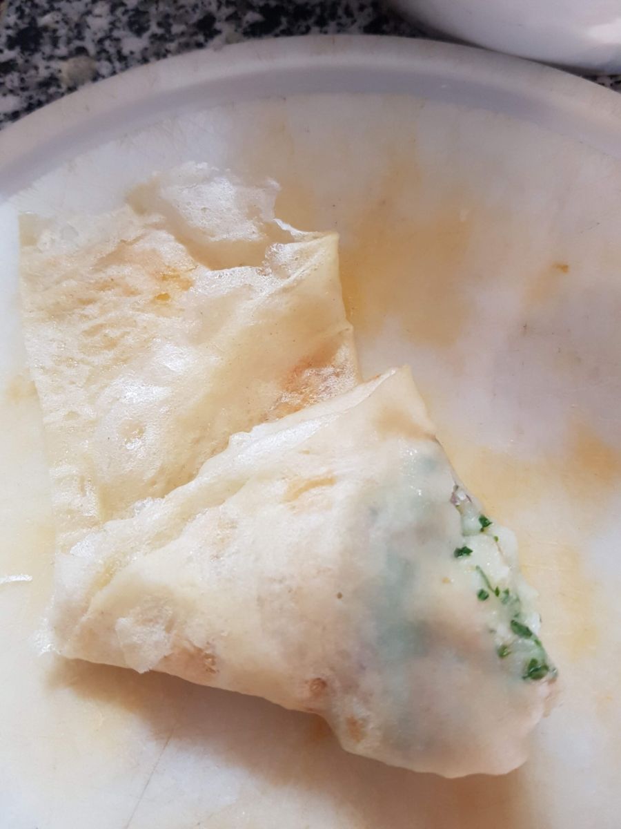 Ebensogut kann man die Brik als Rollen machen: dazu ein Blatt nehmen, die Füllung längs am unteren Rand verteilen. Erst von der unteren Breitseite einschlagen, dann die Seiten einklappen, dann fertig einrollen (wie bei dengefüllten Weinblättern).