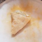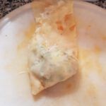 Die Brikblätter mit der Schere halbieren. Auf je 1 halbes Blatt 1 EL Füllung auf das untere Ende legen. 4 x Dreiecke nach rechts und links klappen wie auf dem Foto.