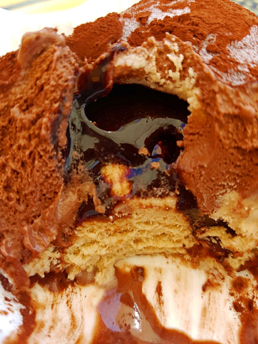 Ich fuhr weiterhin Autostrada Richtung Palermo, d.h. erst mal Reggio Calabria, die auch weiterhin kostenlos war. Und fast leer. Kaum Verkehr, wunderbare Landschaft. Ein Traum.  Unterwegs sah ich ein Schild: Pizzo, 15 km. Beim Googeln nach einer günstigen Unterkunft war ich auf eine Seite gestoßen, in der Tartufo-Eis in Pizzo empfohlen wurde. Da ich eh noch nichts gefrühstückt hatte, beschloss ich, dorthin einen Abstecher zu machen und dieses Eis, das ich bislang nicht gegessen hatte, zu probieren. Gesagt, getan. Mit etwas Glück fand ich in dem verwinkelten, steil am Berghang liegenden Örtchen mit extrem engen Gassen sogar einen Parkplatz und ging zum angegebenen Platz, Piazza della Republica. Von den neun rings um den Platz liegenden Cafeterias, Bars und Ristorantes suchte ich mir ein Café aus und genoss Tartufo nero, dunkles Tartufo-Eis.  Boah, echt genial. Außen Nougat-Eis, innen Vanille und ganz innen flüssige dunkle Schokolade. Dazu einen Cappuccino (den ich lieber kalt werden ließ, bevor mir das Eis warm wurde…).