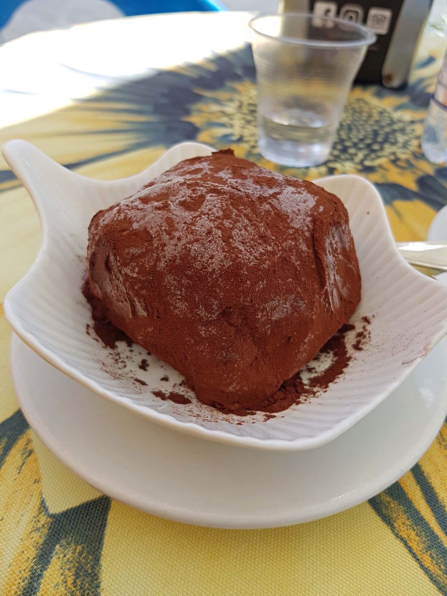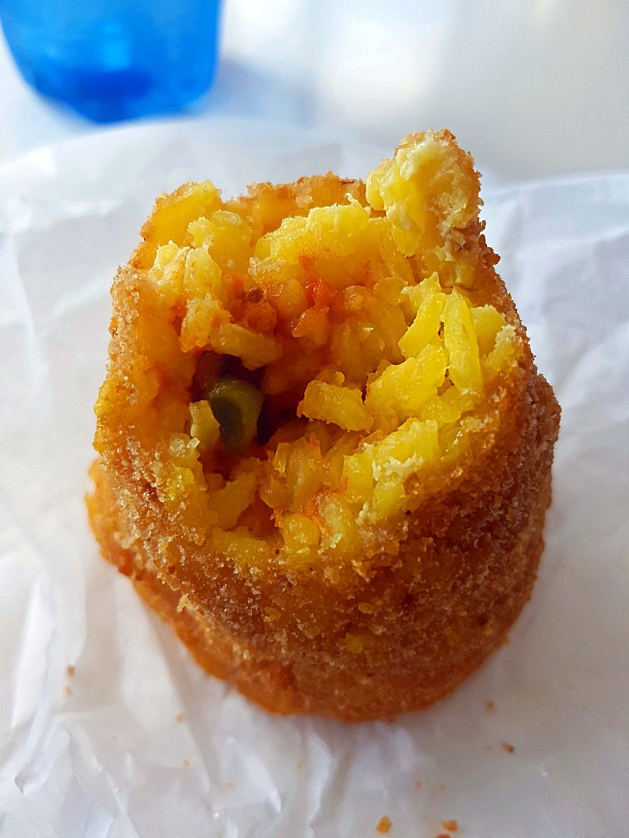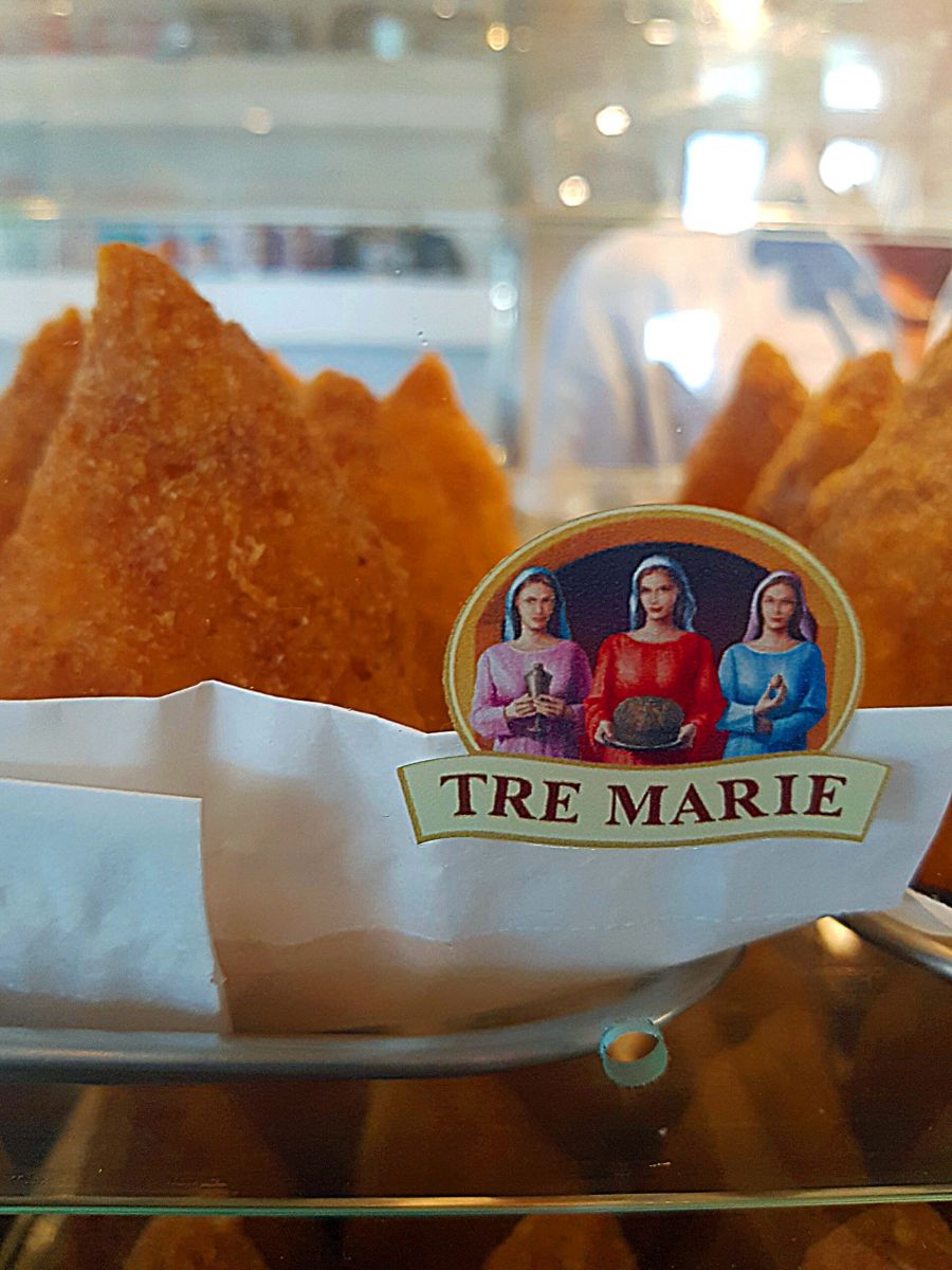 An der Bar auf dem Schiff entdeckte ich seltsame Kegel, die ich für irgendeine süße Spezialität hielt.  Sie hießen „Tre Marie“ und die Passagiere kauften sie emsig. Also muss ich probieren. Es geht ja nicht, dass ich was verpasse.  Also, bei „Tre Marie“ handelt es sich um gekochten Reis, zu einem Kegel geformt und mit Tomatensoße, Erbsen und Käse gefüllt. Also es schmeckte eher nach Resteessen, daraus ist es sicher mal entstanden. Und die 3 kommt vielleicht von den drei Arbeitsgängen, Reis, Tomatensoße, frittieren? Keine Ahnung.  Ich hab den Rest auf der Weiterfahrt den Ameisen spendiert, weil ich es nicht wirklich toll fand. Dann doch lieber Knoblauch Grissinis mit Naschtomaten 🙂