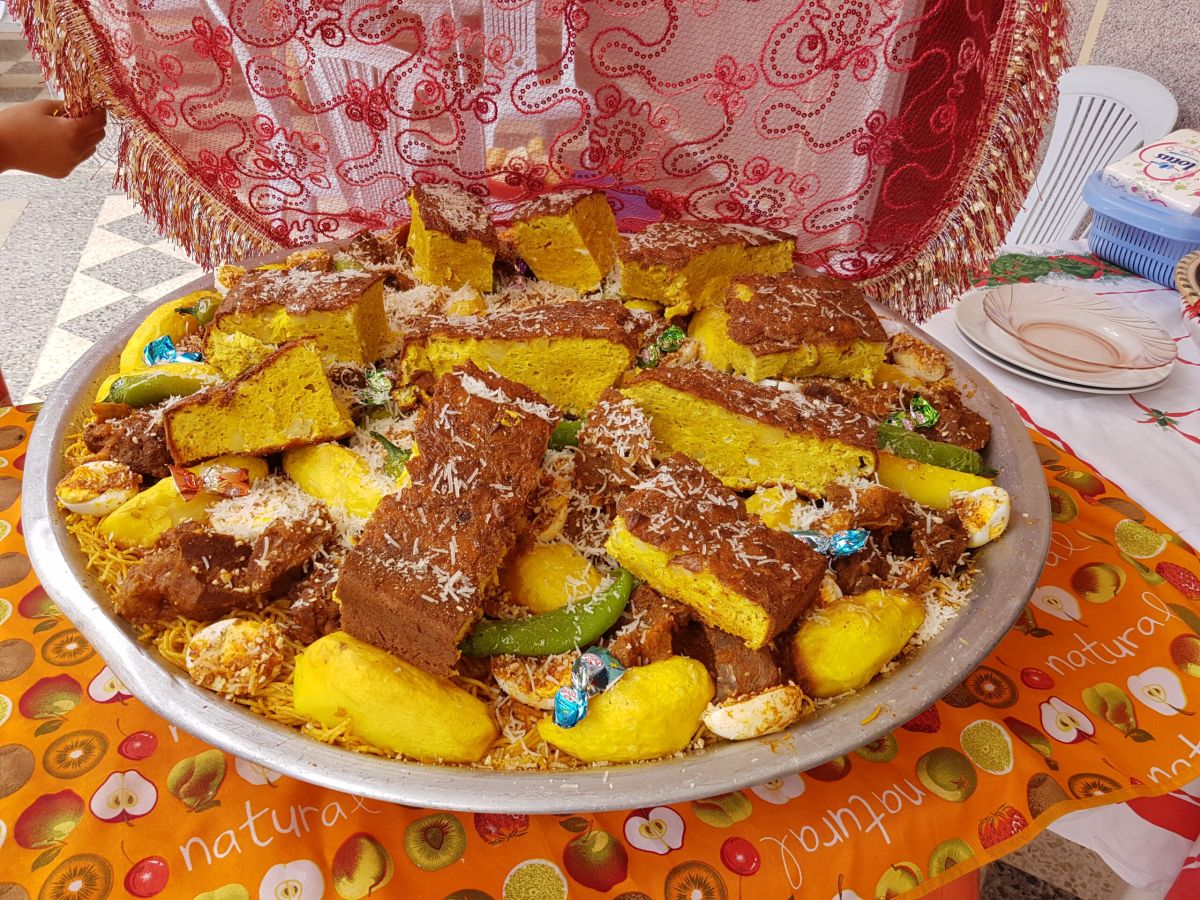 Der Tag, an dem der Ehevertrag unterschrieben wird. Meist vom Bräutigam und vom Vater der Braut, auch wenn die Frauen längst keine Analphabetinnen mehr sind. Es feiern meist fast ausschließlich die weiblichen Mitglieder der Brautfamilie nebst Freundinnen und Nachbarinnen, wenn sie einen eigenen Raum haben. Die dazugehörigen Männer sitzen separat zusammen. Einige sind zum Aufpassen auf die Frauen abkommandiert. Die stehen dann an der Eingangstür und kontrollieren, wer rein will. Es gibt traditionelles Essen: Tadjine, Couscous usw. in riesigen Tabletts, die von der Familie des Bräutigams an die Familie der Braut geliefert werden.