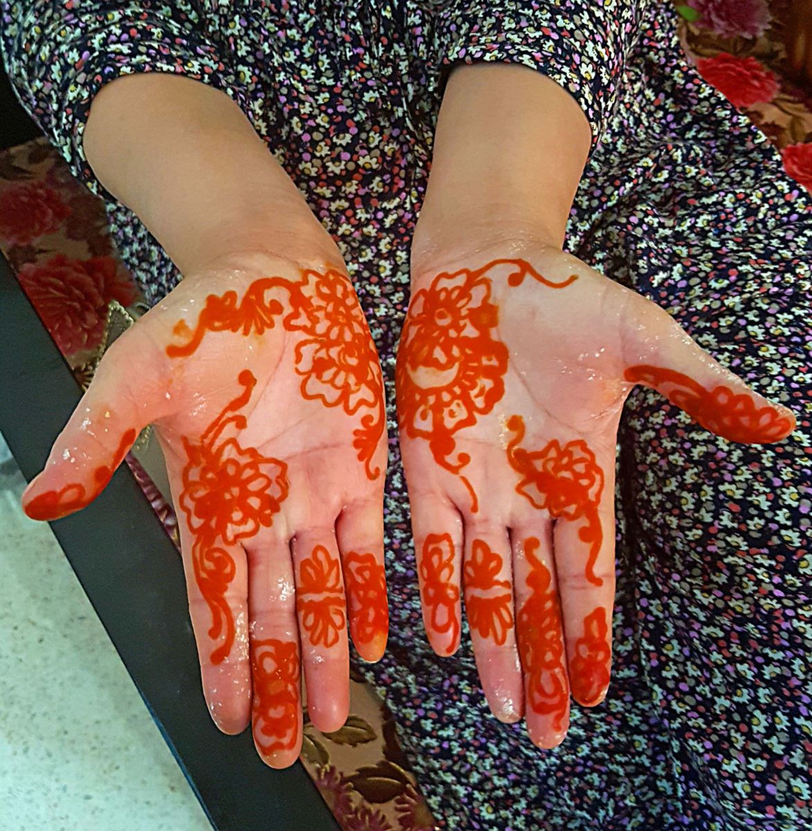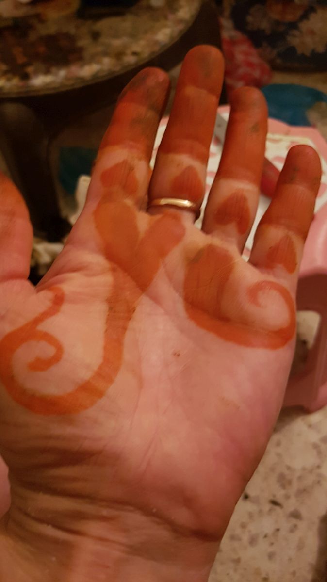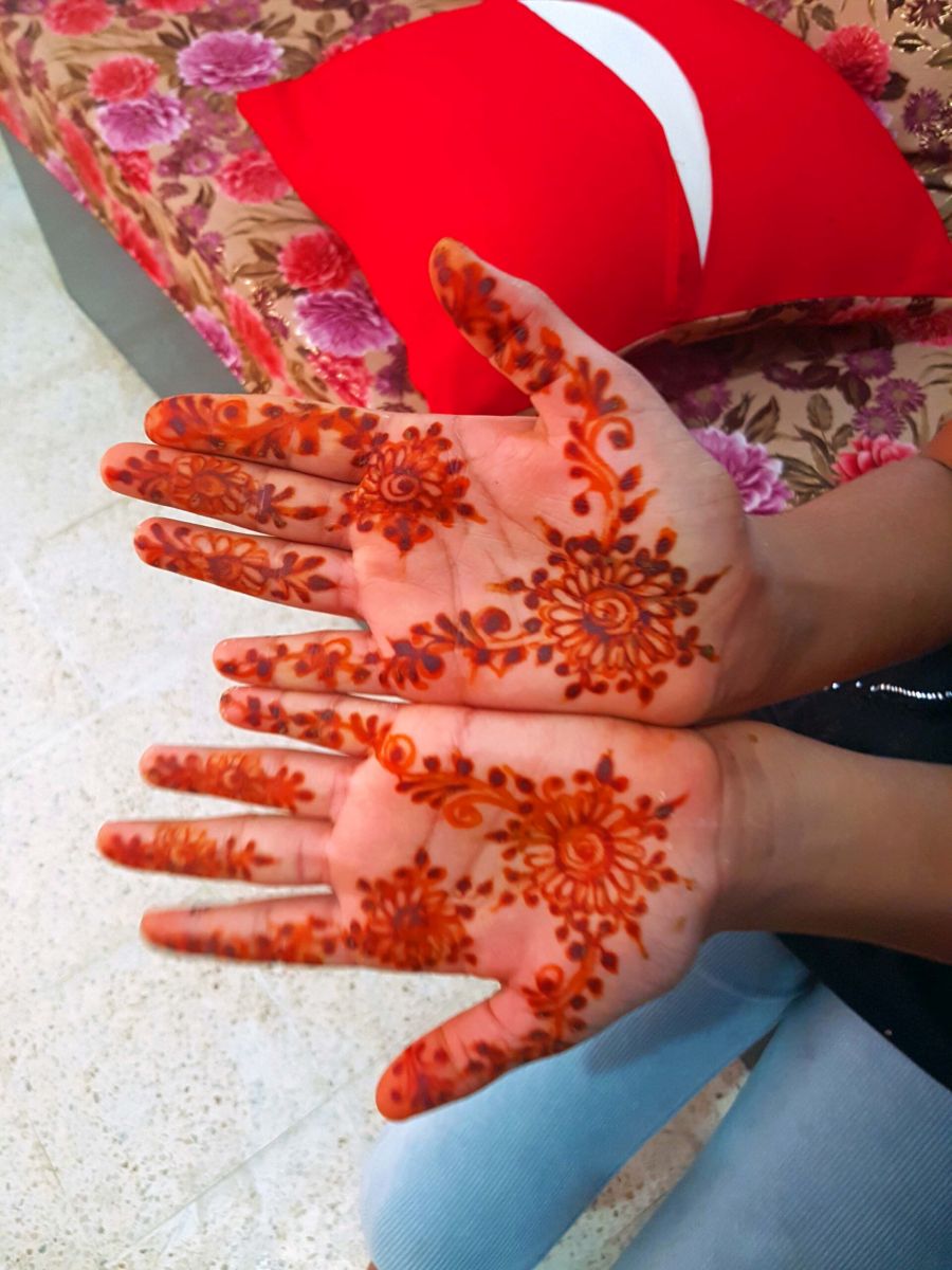 Generell kann man den eigenen Nagellack vorher runtermachen, dann färbt das Henna auch die Nägel. Und das hält ewig, d.h. es dauert Monate bis es wieder herausgewachsen ist. Die Muster für das Hargouz sucht man sich meist auch schon Wochen im Voraus aus dem Internet oder anderen Vorlagen: für Finger, für Handrücken, Handgelenke, Unterarme, Oberarme, Rücken, Füße, Beine……..je mehr desto länger sitzt man und desto teurer natürlich…..5-7 Euro für alles zusammen :).
