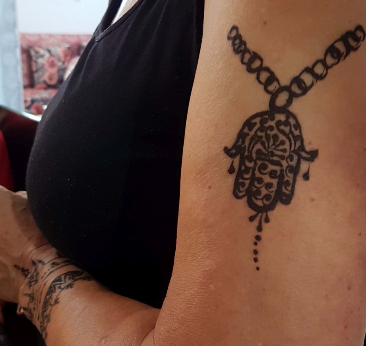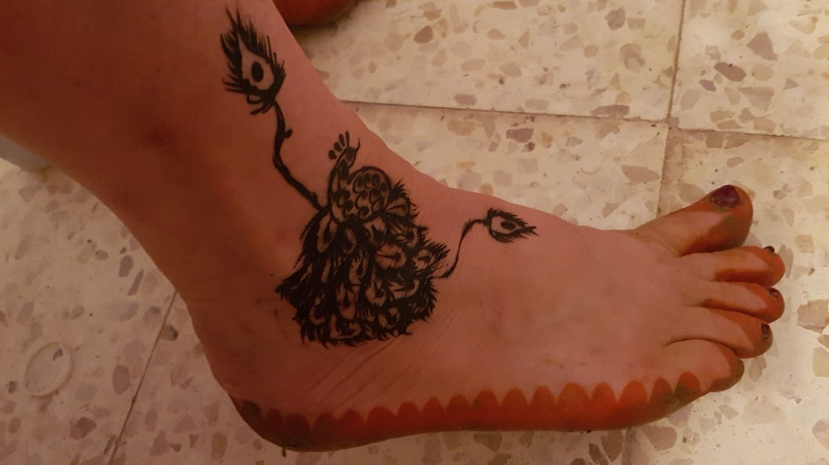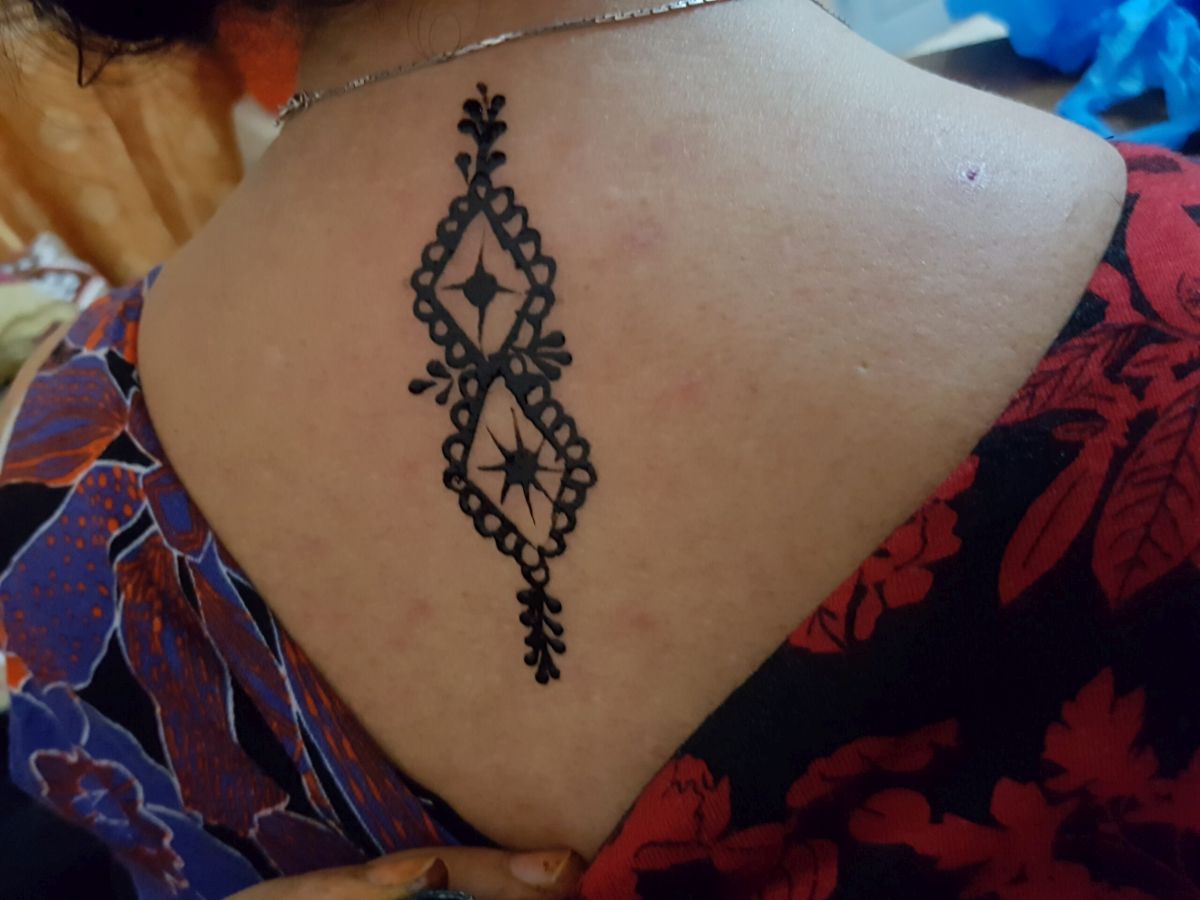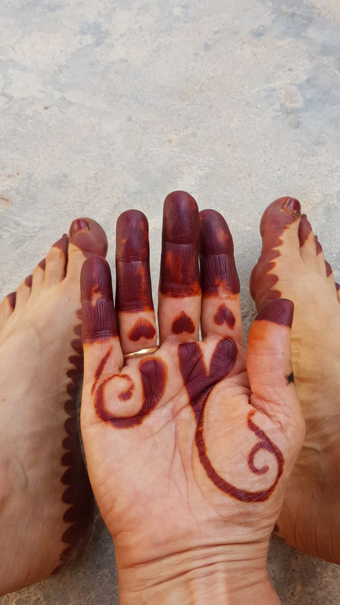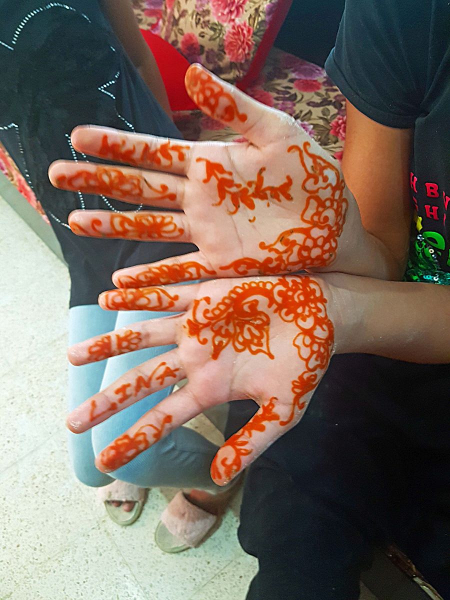 Der Hennatag ist der nervigste für mich, denn man wartet meist lange, bis man dran ist und dann wartet man 2-3 Stunden mit in Plastiktüten verpackten Füßen und Händen. Da kann man gar nichts tun, nicht lesen, nicht mit Handy spielen, nur liegen oder sitzen und warten. 20180805_184050Wenn der Hennabrei dann wieder abgerieben ist (nicht waschen, er darf bis zum nächsten Tag möglichst nicht mit Wasser in Berührung kommen, denn er dunkelt erst noch nach), wird etwas Olivenöl daraufgerieben und man schläft tunlichst mit Socken. Am nächsten Tag kommt Hargouz dazu, die feinen schwarzen Strichzeichnungen, die es von Marokko bis Indien in unterschiedlichsten Ausführungen gibt. Auch hier muß man warten, bis es trocken ist und soll einen Tag nicht mit Wasser in Berührung kommen, was schwierig ist, wenn es 36 Grad hat und die Haut leicht feucht ist…naja, und kochen, sich waschen…… Zum Glück wird es diesmal bei der Schwiegermutter im Wohnzimmer gemacht: da gibts Klimaanlage und da ich gleich nebenan wohne, kann ich mich direkt anschließend noch vor den Ventilator stellen.
