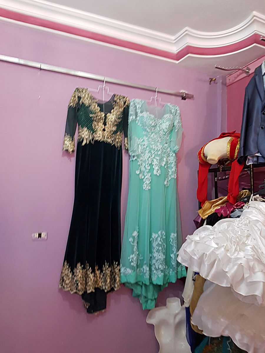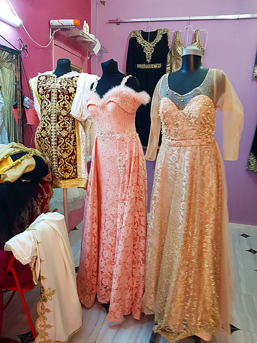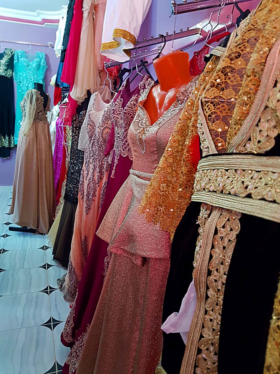 Seit Monaten (!) werden von den Frauen und jungen Mädchen der Familien sämtliche einschlägigen Internetseiten durchstöbert auf der Suche nach dem passenden Outfit für die drei Hochzeitstage, denn nicht nur die Braut, sondern auch die Frauen der Familie brauchen drei Kleider. Am ersten Tag ist ein traditionelles Kleid angesagt, also ein folkloristisches, das aber nicht unbedingt aus der Gegend stammen muß, aus der man kommt. Diese Kleider werden so gut wie immer geliehen, für 30-80 Dinar, 10-35 Euro. Dafür gibt es zahlreiche kleine Hanouts, Läden, mit Kostümverleih für diese Zwecke. Die Kleider für den zweiten Tag sind mehr oder weniger aufwändige Abendkleider. Das Kleid für den dritten Tag, den Höhepunkt, die eigentliche Hochzeit ist das glamouröseste, das Frau sich leisten kann.