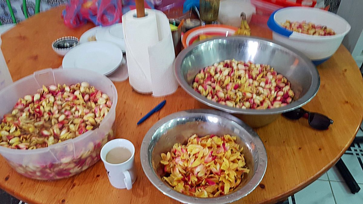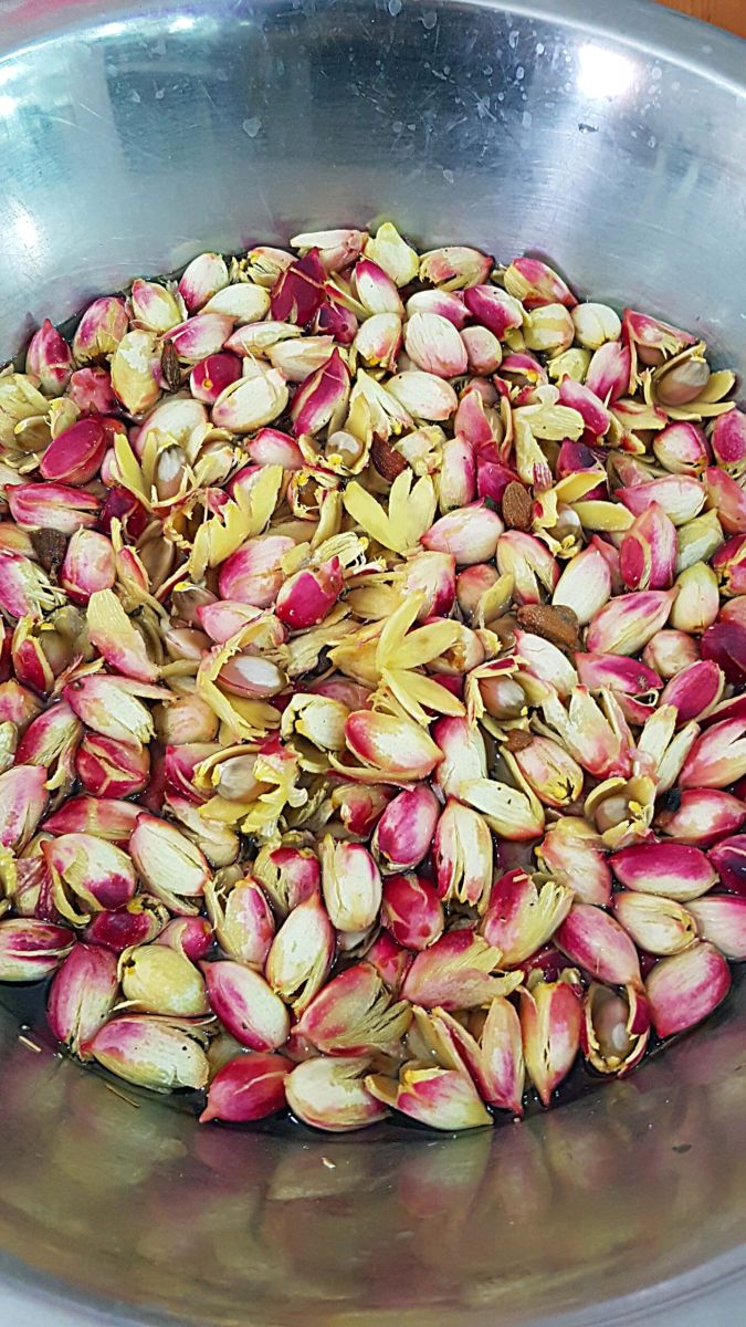 Was hier zu sehen ist, sind die Pistazien in ihrer äußeren Fruchtfleischhülle. Bei reifen Pistazien läßt sich diese ganz leicht durch Druck öffnen und entfernen. Die reifen innenliegenden Kerne werden für den Eigenbedarf am besten an der Sonne getrocknet. Um zu sehen, welche Kerne reif sind, kann man sie in eine Wasserwanne schütten: die reifen sinken zum Boden, die unreifen schwimmen oben.