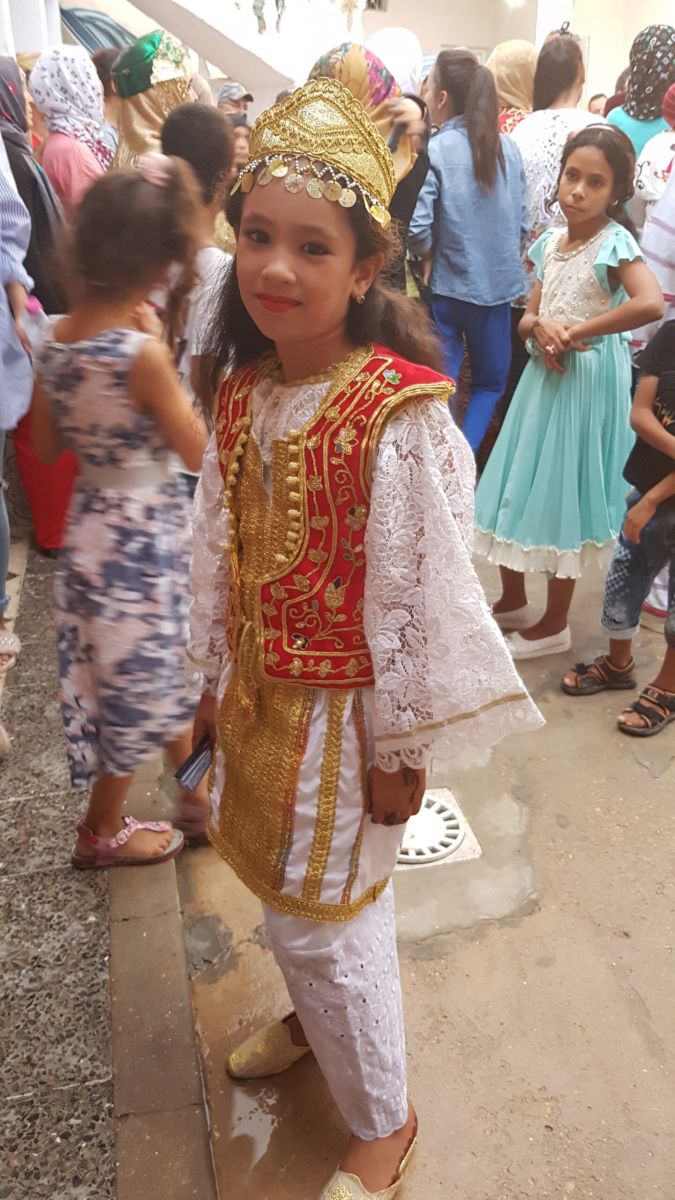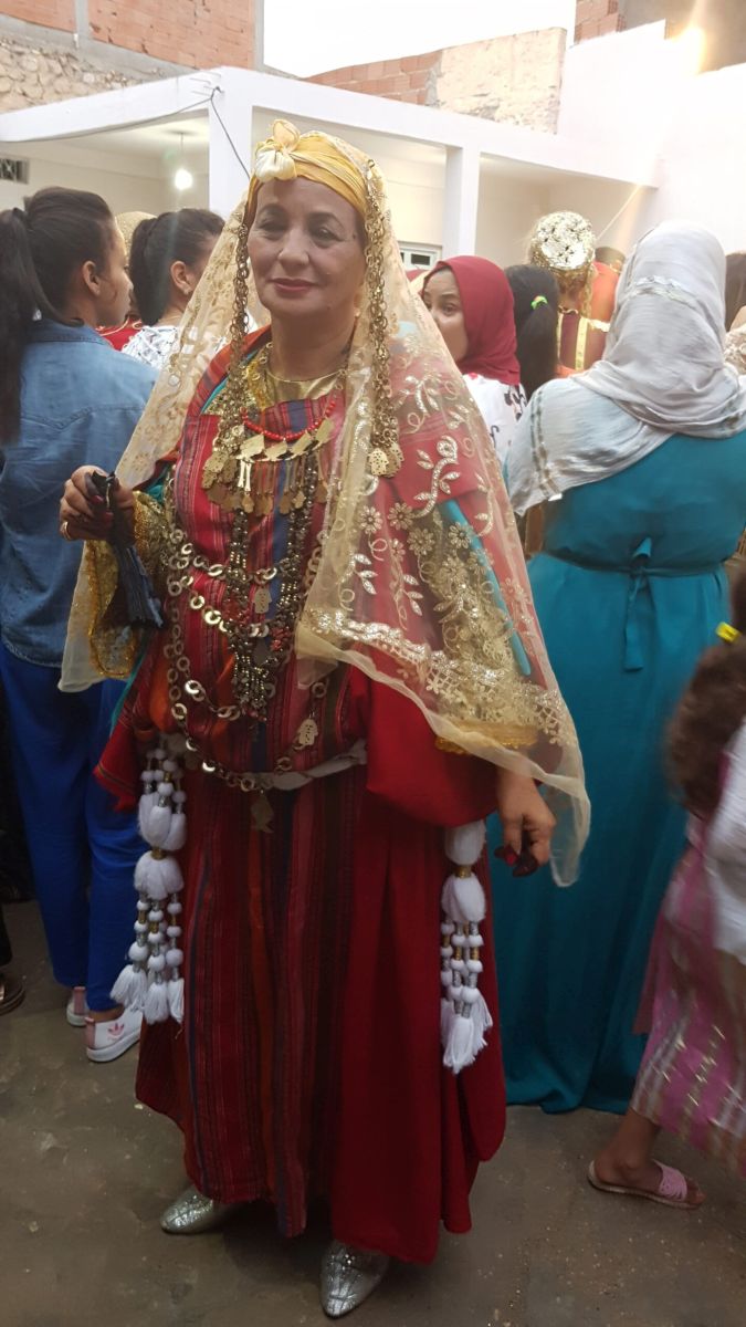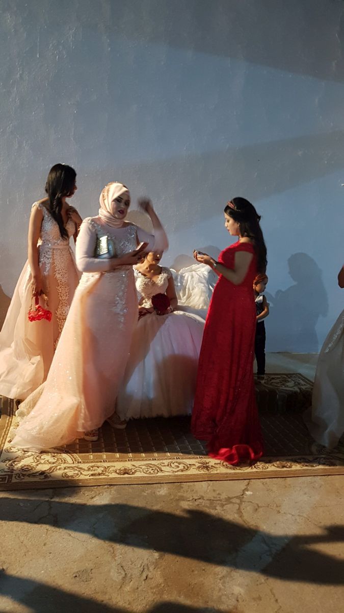Doch wir stellten erst mal nur die Taschen ab und gingen wieder zurück und ein Stück weiter zu einem angemieteten Hochzeitssaal, wo wir mit leckerem Essen bewirtet wurden. Couscous mit Mandeln, slata tunsia, slata meshwiya, Lammfleisch, Tadschien, Obst, Kuchen. Nach dem Essen mussten wieder alle zurück ins Haus, diesmal zum Umkleiden und Aufbrezeln. Ich hatte mich schon zu Hause geschminkt – und wozu gibt es Fixierspray? Das ist bei der Hitze einfach genial. Sonst wäre ich nach einer halben Stunde schon völlig zerlaufen gewesen.