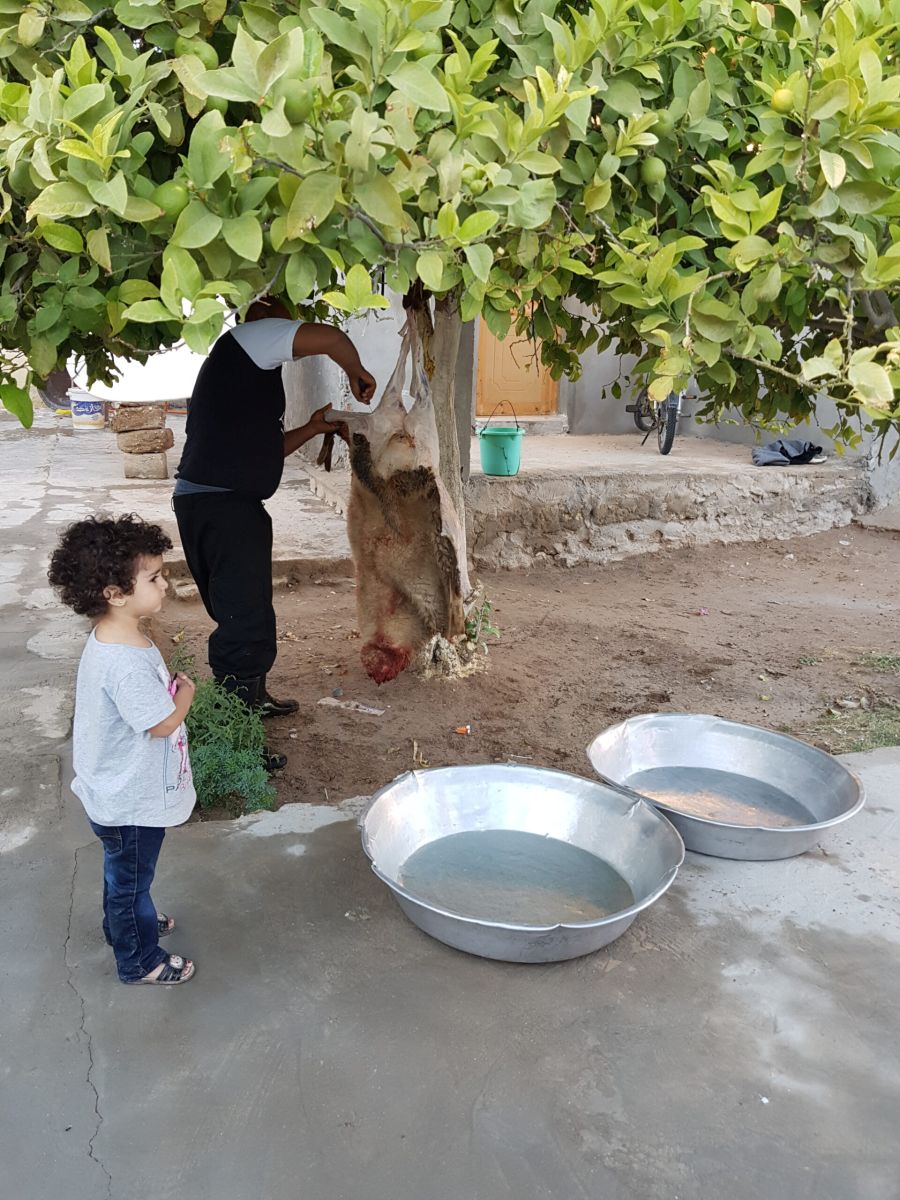 Zu Hause angekommen, wurde dort schon wieder fleißig gefegt und geräumt, geputzt und dekoriert und gekocht. Abends werden die Schafe geschlachtet, wieviele es diesmal sind, hab ich nicht mitbekommen. Letztes Mal waren es drei, je nach Größe kostet eines zwischen 500-800 Dinar (160-250 Euro).