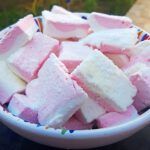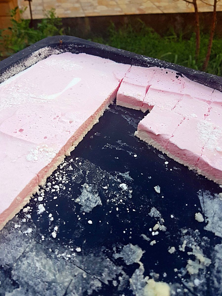Will man die Marshmellows bunt, dann einen Teil des Zuckerschaumes in die Form gießen und den im Mixer verbliebenen Teil färben und dann auf den weißen Teil gießen.