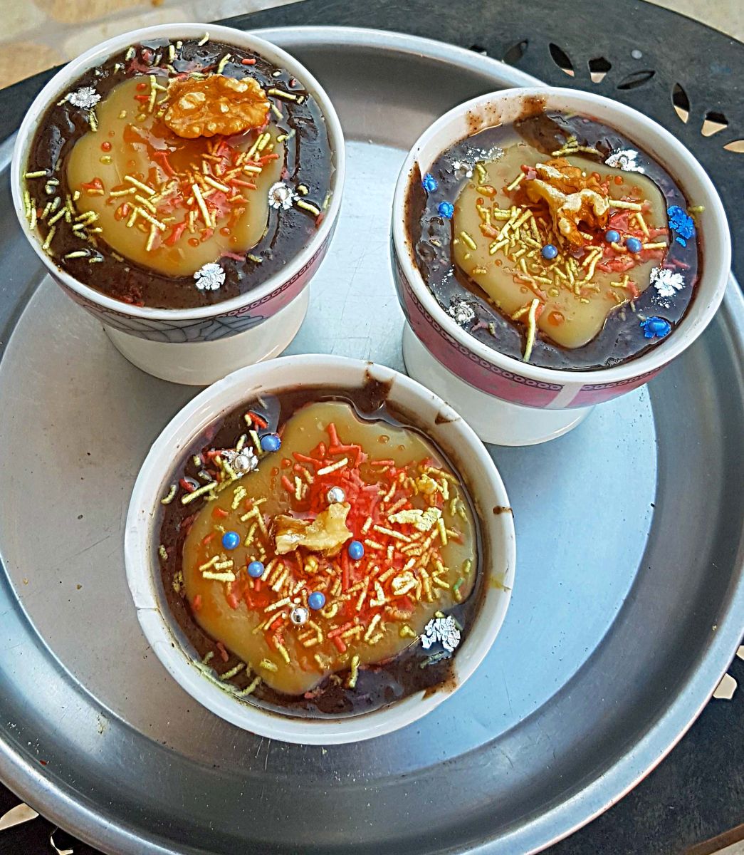 Anläßlich des Moulid en-Nabi, Geburtstag des Propheten Mohamed – der 2019 auf den 9. November fällt – gibt es in Tunesien schon zum Frühstück eine cremige Süßspeise: Ein dunkler Pudding mit dem Geschmack der  Aleppo Kiefer (Zgougou) Dieses Bild hat ein leeres alt-Attribut; sein Dateiname ist aleppokiefer.jpg.unten und ein heller, aus Maisstärke hergestellter Pudding oben drauf. Dekoration erfolgt nach Lust, Geduld und Geldbeutel.