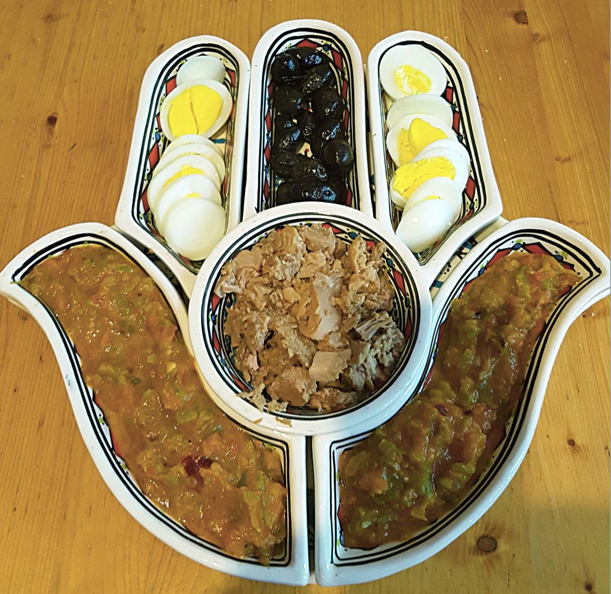 Tomaten entkernen und mit den milden Paprika klein würfeln. Knoblauch durchpressen, dazu geben, mit 1/2 TL Salz, etwas Pfeffer, 1 TL Kumin und 1/2 TL Koriander würzen. Einen Schuss Olivenöl nicht vergessen. Die Zwiebeln und die scharfen Peperoni (Kerne eventuell vorher entfernen) mit etwas Olivenöl mit dem Mixstab pürieren. Beides zusammenrühren, in eine Schale füllen, nochmal mit etwas Olivenöl begießen und ggf. mit hartgekochten Eiern und schwarzen Oliven dekorieren.