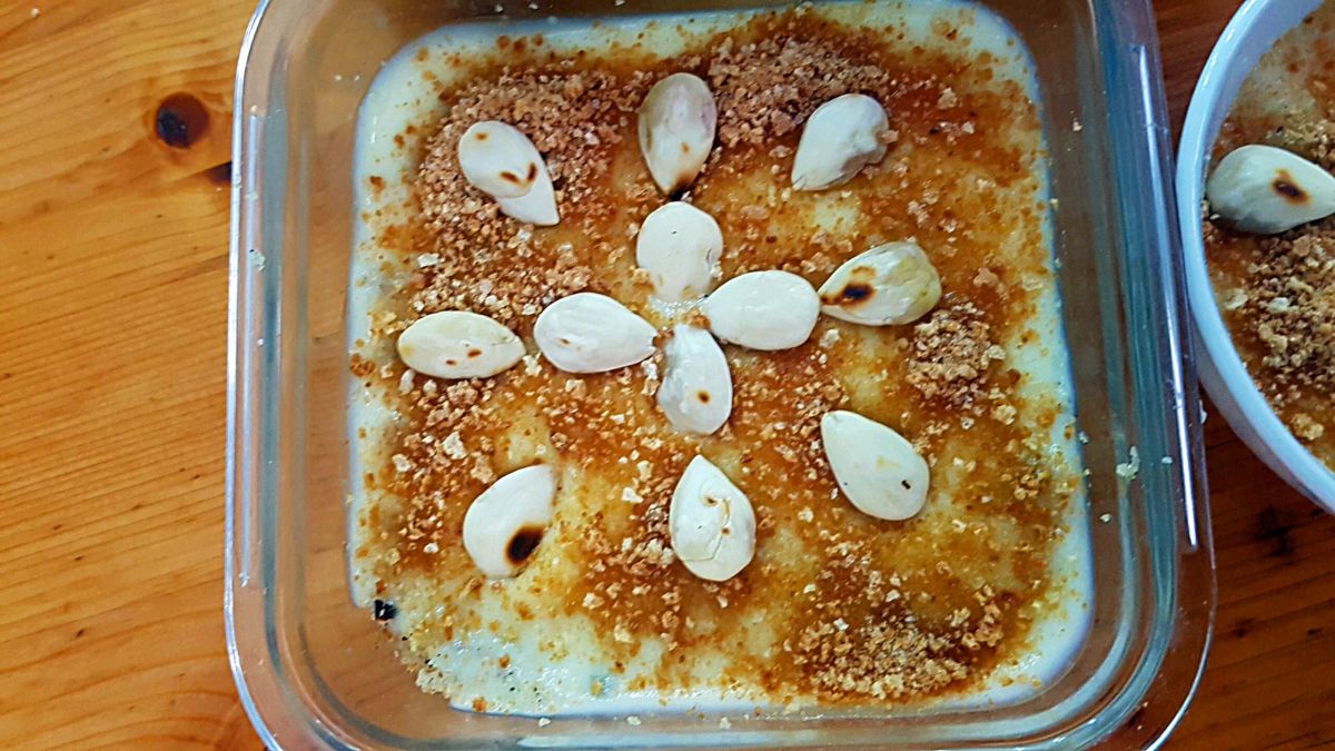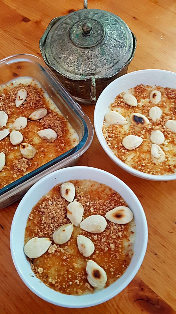 Unten ein süßer Couscous mit Nüssen, Rosinen und Zimt und oben ein cremiger Vanillepudding, verfeinert mit Orangenblütenwasser und dekoriert mit Mandeln und zerbröselten Amaretti. Hm, lecker!