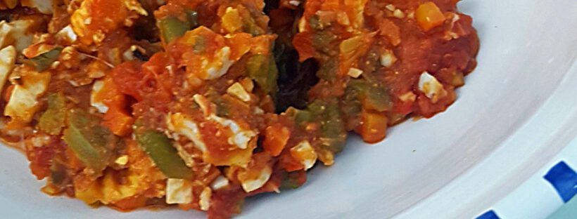 Paprika halbieren, entkernen und in Olivenöl (oder Airfryer) knusprig braten. Ebenso die Tomaten und die Zwiebel.