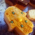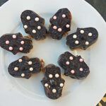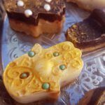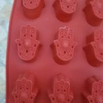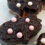 Damit man das Muster besser sieht, braucht es einen Überzug aus Schokolade, beziehungsweise einen Schokodeckel. Dazu füllt man heiße Schokolade – Rezept siehe unten – (die kann auch weiß sein) in die Form (einige Millimeter tief) und steckt die vorher gut gekühlte und fest gewordene geformte „Energiemasse“ direkt nochmal darauf und stellt sie wieder in den Kühlschrank oder am besten kurz in die Gefriertruhe. So kann man sie einfacher und sicherer aus der Form nehmen. Mit Lebensmittel-Goldpuder kann man die Konturen noch besser hervorheben.