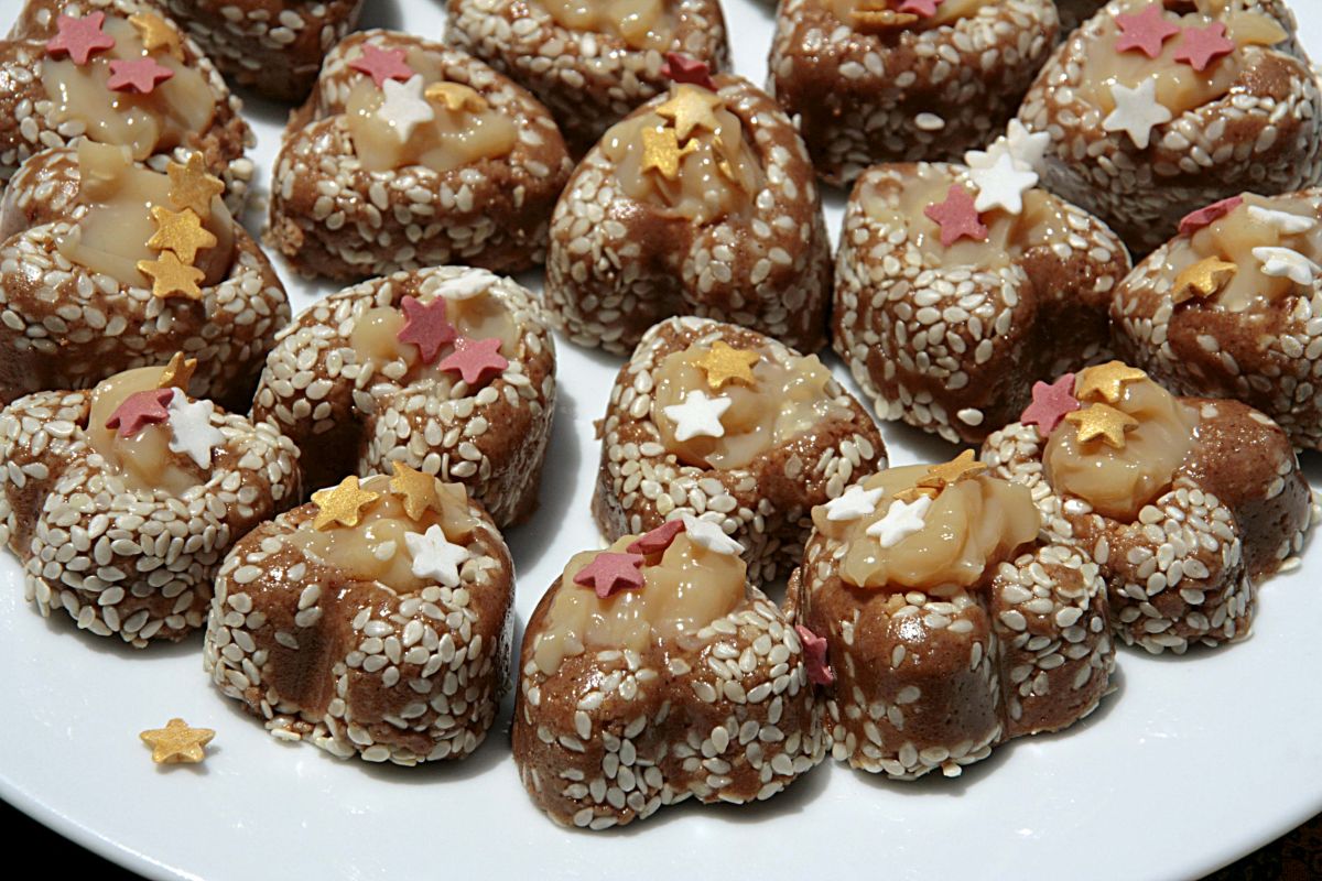 Eine weitere Füllung besteht aus Chamiya, gemahlenen Erdnüssen, zerbröselten Keksen und Nougatschokolade, etwas Sesam und Karamelfüllung.