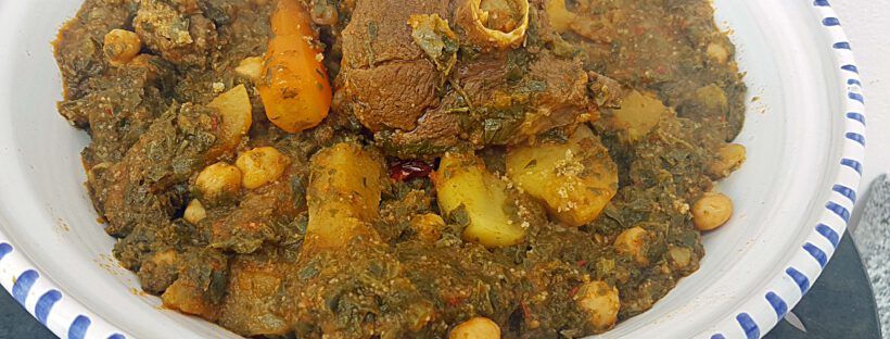 Wenn das Wasser kocht, 1,5 Gläser Olivenöl dazugeben, dann die geschnittenen Morschaanblätter und den Mangold zugeben. Das Fleisch dazu. Salzen. Bis auf die Chilischote, das Ras el Hanout und das Basilikum alles weitere zugeben; die pürierten Tomaten und Zwiebel, Tomatenmark, Zeena, Kartoffeln, Karotten, Rüben. Kichererbsen. Couscous aufsetzen.