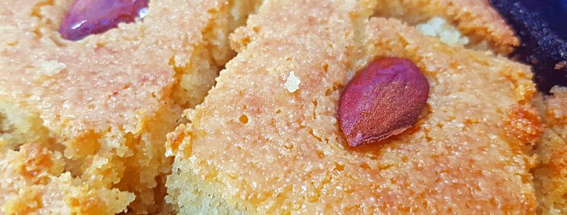 Basbousa ist ein schneller Joghurt-Grieß-Kuchen und stammt ursprünglich auch Ägypten. Allerdings ist er inzwischen von der Türkei über Griechenland im gesamten orientalischen Mittemeerraum bis nach Marokko verbreitet. Er ist absolut unkompliziert und wenn man schon fertigen kalten Sirup im Haus hat, kann man ihn fast sogar noch backen, wenn die Gäste schon da sind.
