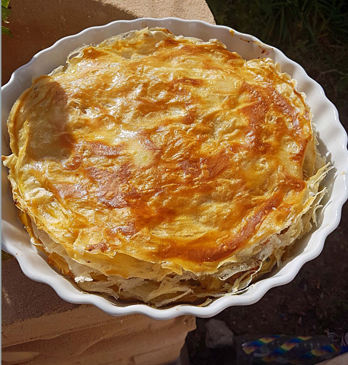 Eine flache Backform (ca. 28 cm Durchmesser, 3 cm Höhe) mit Öl auspinseln und 3 Brikblätter hinein legen.