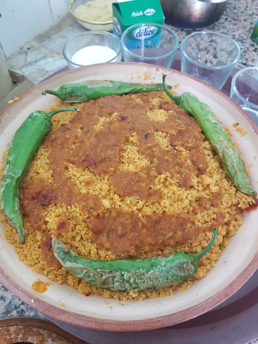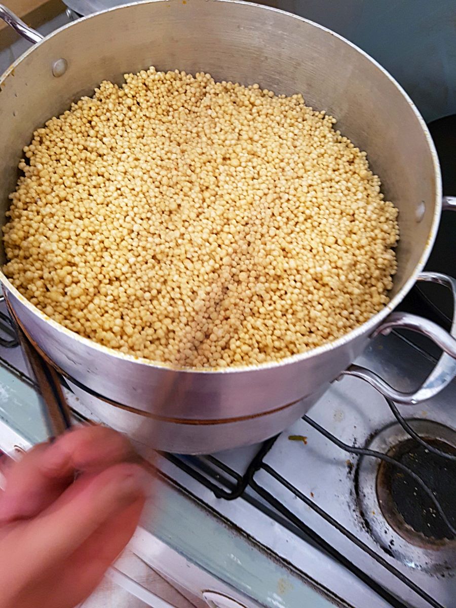 Wird ein Couscousgericht auf traditionelle Weise hergestellt, so bekommt der Grieß Zeit zum Quellen, Ausdampfen und Abkühlen, darf wieder ins Dampfbad, darf wieder ausruhen und dieses Ritual – ähnlich einem Saunagang – geschieht beim Kochvorgang, wenn es optimal zugeht, drei Mal.