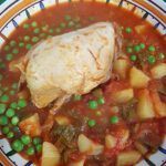 Öl erhitzen, Huhn und Zwiebeln kurz anschwitzen, die pürierten Tomaten zugeben, ebenso die Kartoffeln und die Paprikastreifen. Mit Wasser aufgießen, so dass alles knapp bedeckt ist. Salz und Gewürze (ohne Harissa) hinzufügen. Auf kleiner Flamme 45 Min kochen.