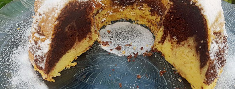 Den Teig einfüllen resp. wenn man Marmorkuchen machen will, die Hälfte des Teiges einfüllen und die andere Hälfte mit 2 EL Kakaopulver vermischen, darüber füllen und mit einer Gabel oder einem Stäbchen Muster durch den Teig ziehen.