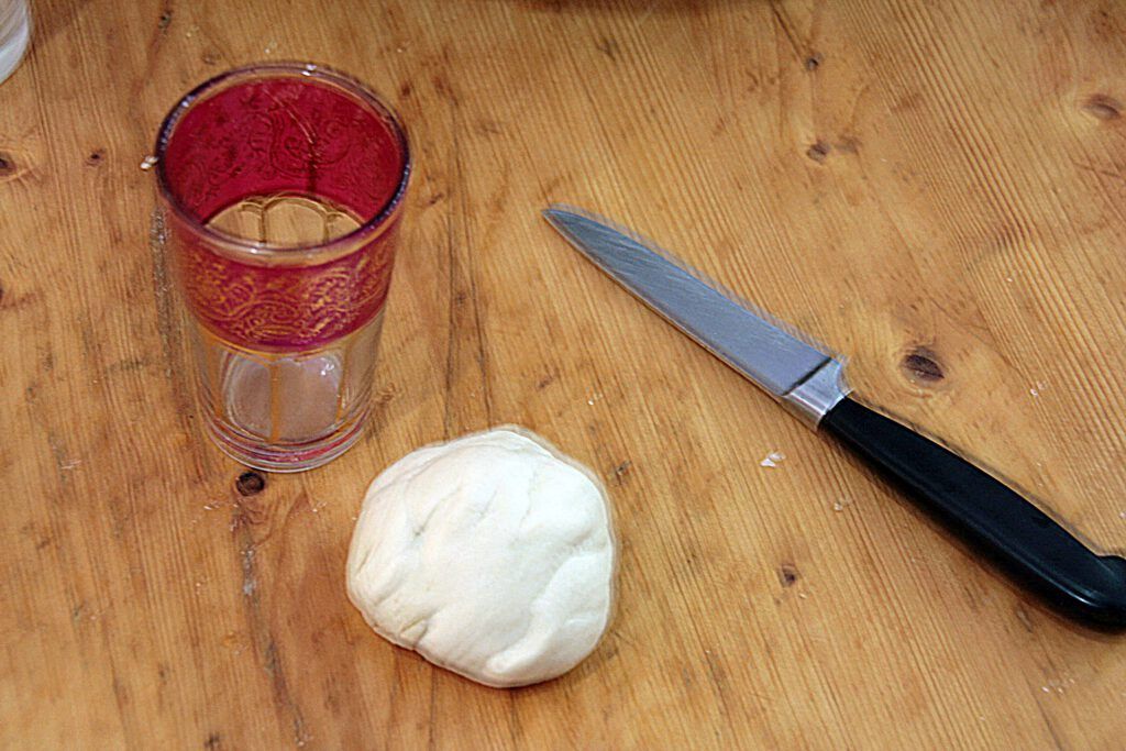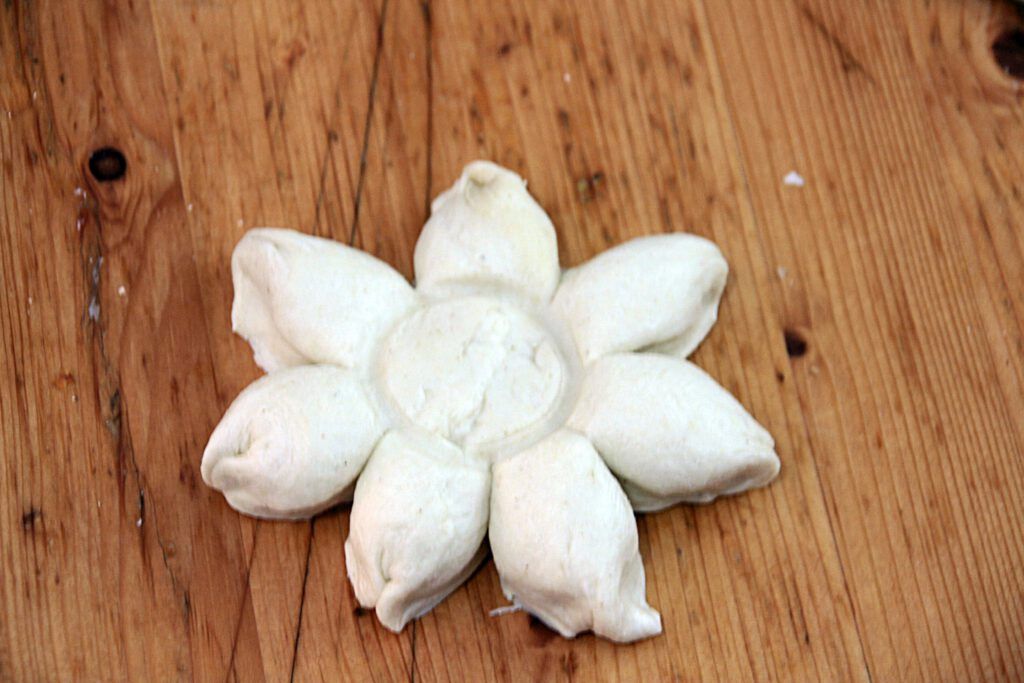 Kleine Bällchen formen. Ein Glas hineindrücken. Ringsherum mit dem Messer Einschnitte machen und diese zu einer Spitze formen. Das Glas wegnehmen. Harissa in die Mitte streichen. Optional den Teig mit Eigelb oder Milch einstreichen und mit Sesam bestreuen. Ca. 15 Minuten bei 200 Grad backen, bis die Blumen leicht gebräunt sind.