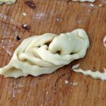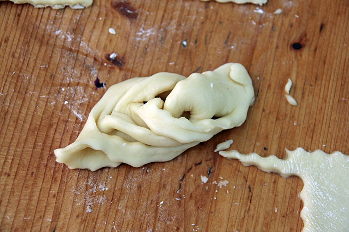 Nun den ersten, dritten und fünften Streifen anheben und vorsichtig zwei Finger durch den „Tunnel“ hineinschieben. Nun die linke untere Ecke (wenn die Streifen in der Senkrechte sind) quasi mit den Fingern einklemmen und den Teig durchziehen (= die Finger mit dem Teig wieder herausziehen und den Keks dabei quasi umstülpen.