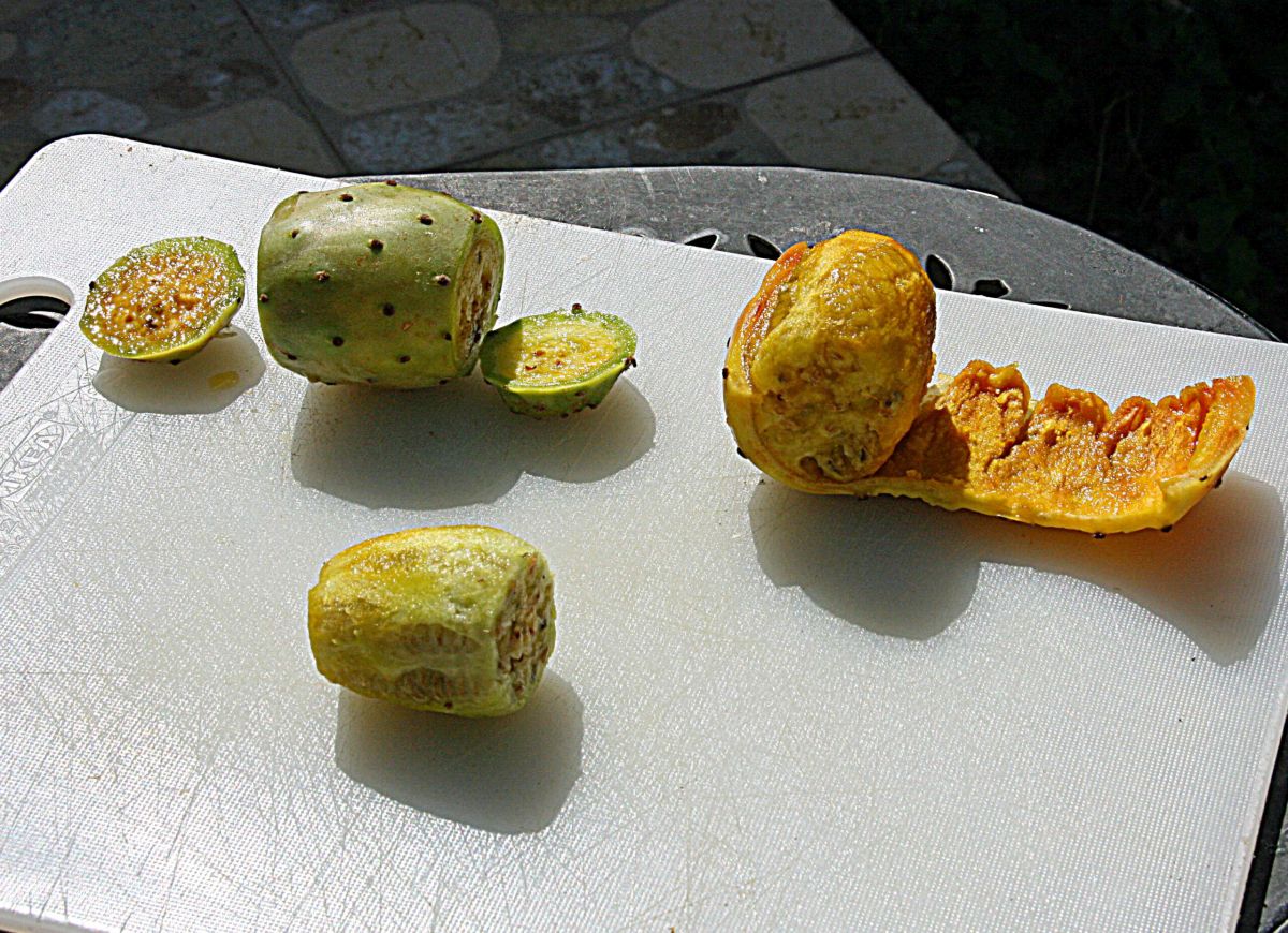 Pflückt man sie selbst, nimmt man tunlichst ein Stück Pappe zu Hilfe und streicht damit KaktusfeigeAmrah3pflückenauch die Dornen und Glochiden ab. Diese feinen Härchen besitzen winzige Widerhaken und sind kaum sichtbar, doch umso spürbarer. Wie winzige Schiefer bleiben sie in der Haut hängen; da hilft nur Seife, um die Haut aufquellen zu lassen, denn mit der Pinzette erwischt man sie kaum. Die eiförmigen bis länglichen, gelbgrünen, orangen oder roten Früchte 6 bis 10 Zentimeter lang.