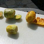 auch die Dornen und Glochiden ab. Diese feinen Härchen besitzen winzige Widerhaken und sind kaum sichtbar, doch umso spürbarer. Wie winzige Schiefer bleiben sie in der Haut hängen; da hilft nur Seife, um die Haut aufquellen zu lassen, denn mit der Pinzette erwischt man sie kaum. Die eiförmigen bis länglichen, gelbgrünen, orangen oder roten Früchte 6 bis 10 Zentimeter lang.