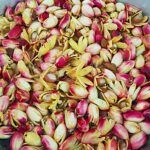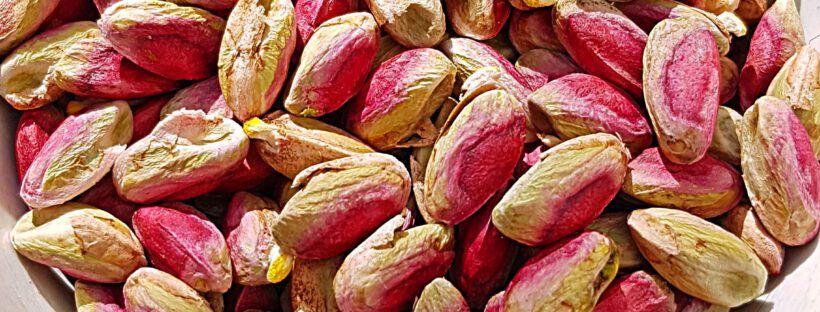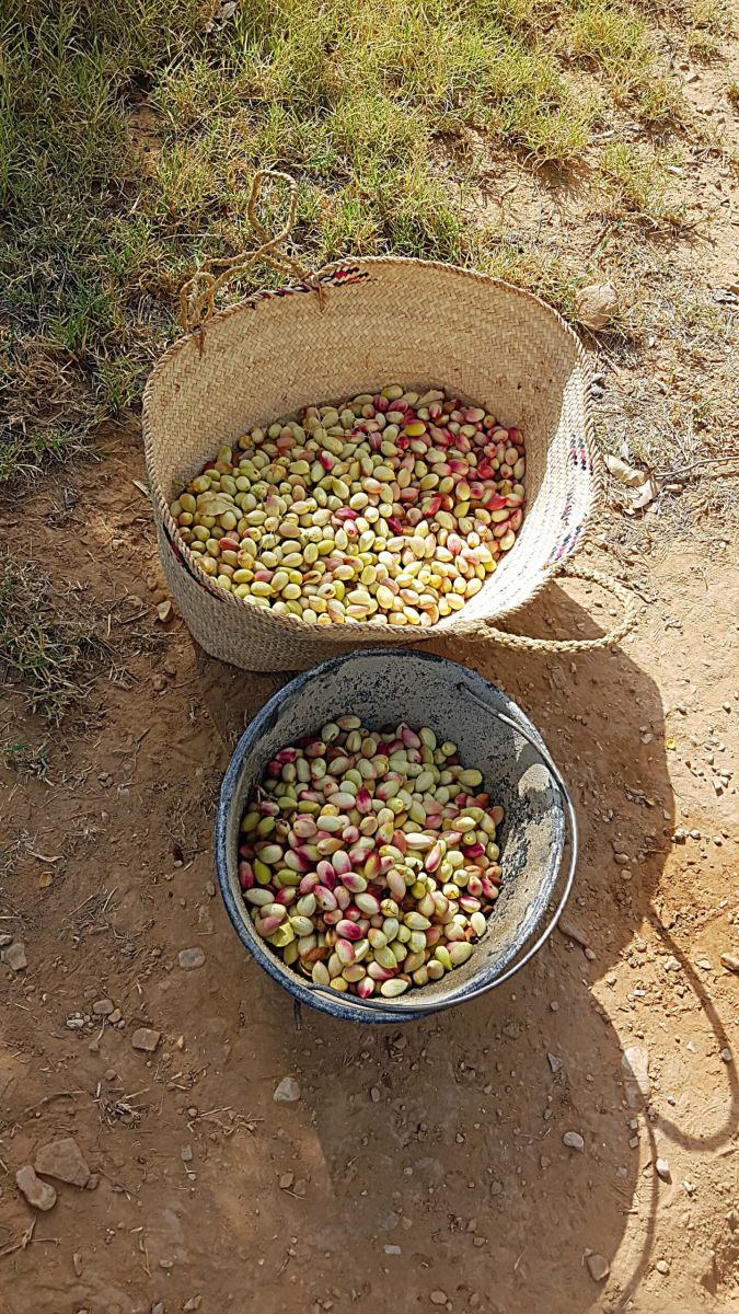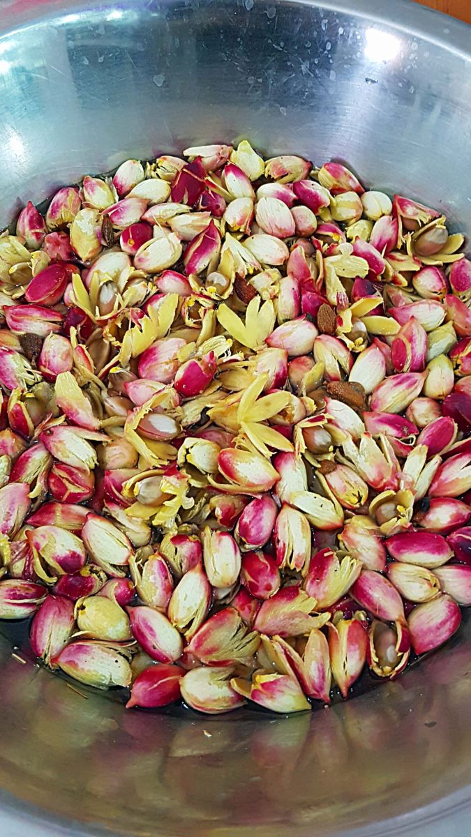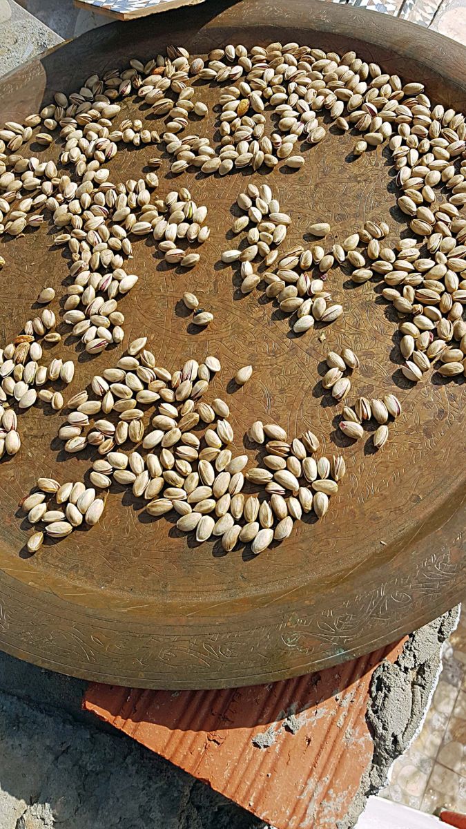 Zu Hause kommen die Pistazien gleich ins Wasserbad, sie platzen auf, öffnen sich wie kleine Seerosen und lassen sich dann leicht aus der Fruchthülle schnipsen. Dennoch, man sitzt eine Weile! Dann kommen sie an die Sonne – außer Reichweite der Kinder, sonst ist gleich nichts mehr übrig – und trocknen 1 Tag. Durch das Trocknen platzt die harte Schale an einem Ende auf und sie sehen dann so aus, wie man sie üblicherweise im Handel kaufen kann. Die harte Schale macht die Früchte nochmal um ca. 80 % schwerer.