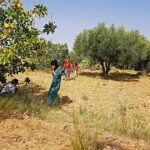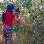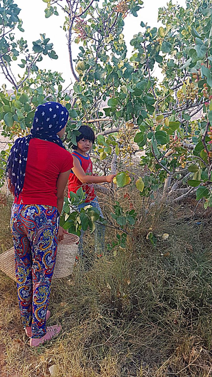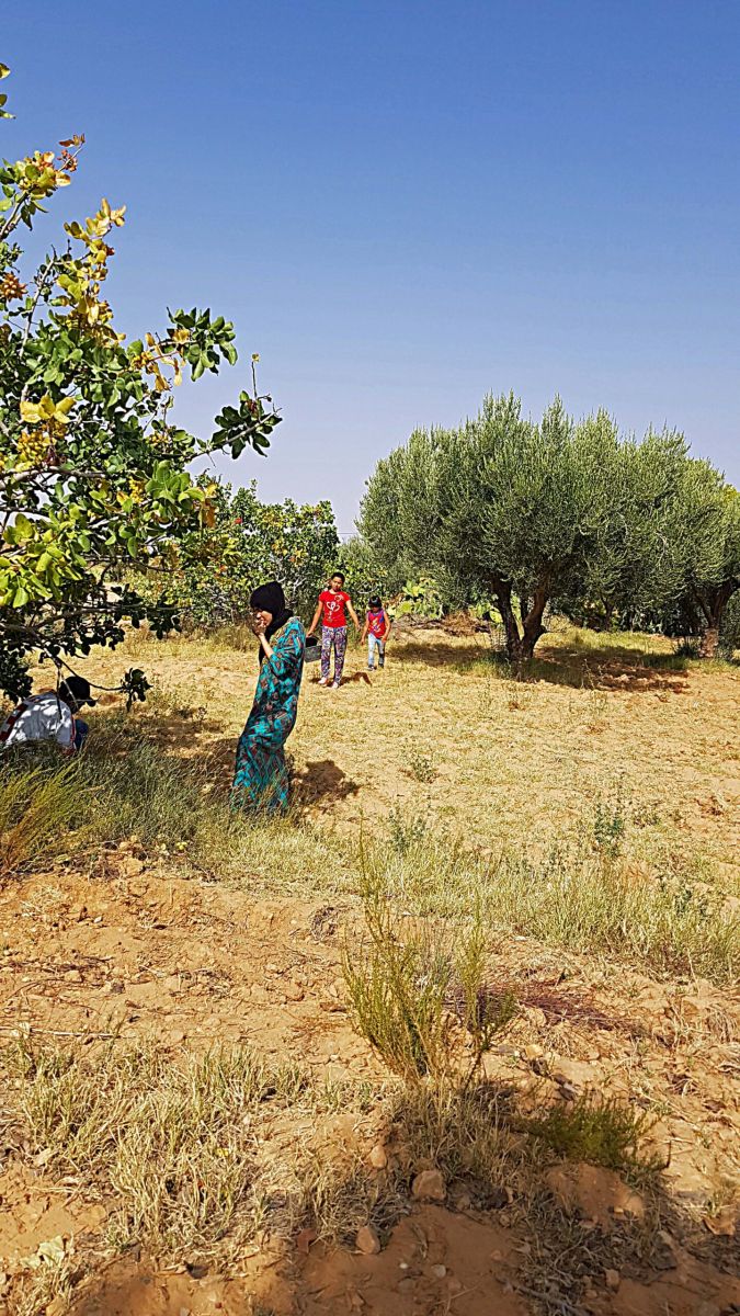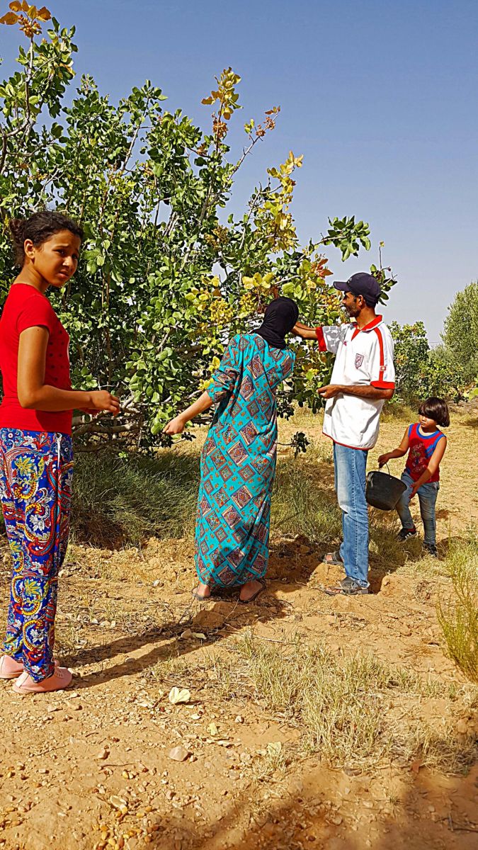 Pistazienernte! Um 5h morgens gehts los, es hat 28 Grad, ist also noch optimal kühl für Mitte August. Alle streiten sich drum, wer auf dem Pickup hinten auf der Ladefläche sitzen darf. Das Wichtigste im Gepäck: eine gefrorene 6l-Wasserflasche, Käse, Oliven, gekochte Eier; Brot holen wir noch beim Bäcker. Denn es gibt ein internationales Phänomen: sobald man außer Haus ist, bekommen Kinder unglaublichen Hunger. Wir fahren die 25 km auf der Nebenstraße bis zu unseren Olivenhainen, wo zwischendrin auch die Mandelbäume und die Pistazien stehen. Ein Teil der Familie hat mehr Mandelbäume, wir haben mehr Pistazienbäume.