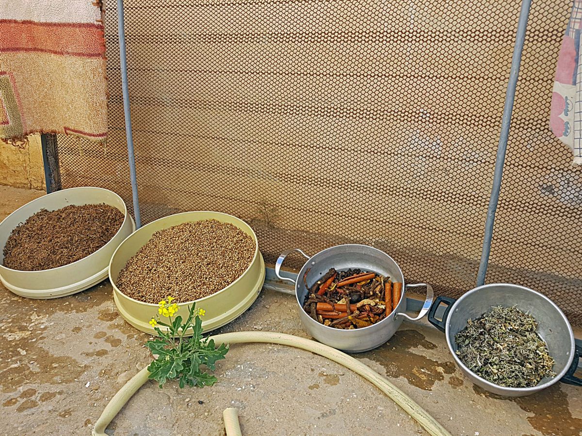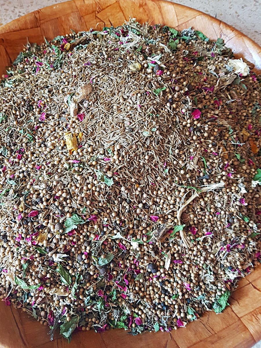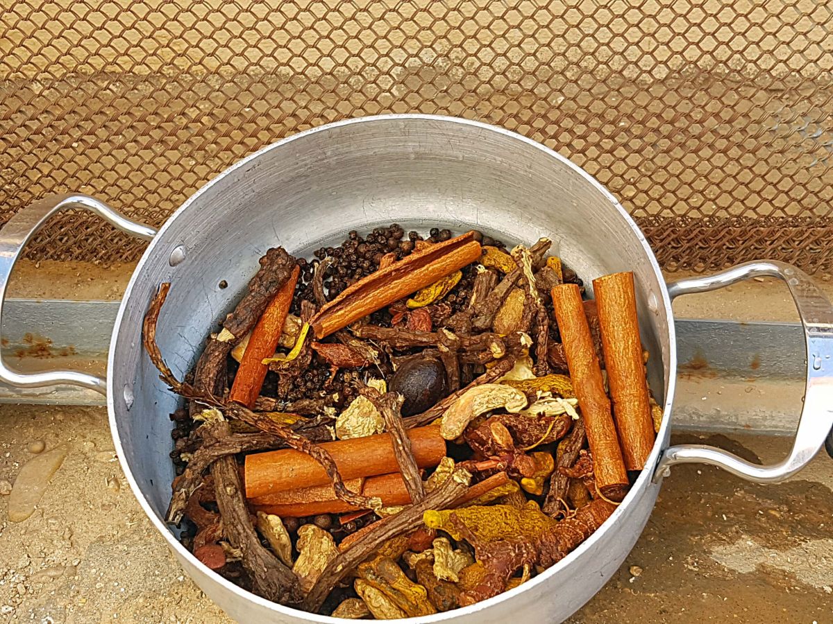 Alle Gewürze außer den getrockneten Rosenblättern, der getrockneten Minze und dem getrockneten Basilikum werden zuerst gewaschen.