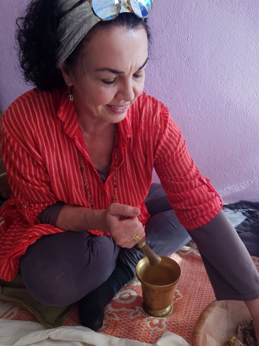 Die groben Gewürze wie Zimtstangen, Muskatnüsse, Pfeffer, Piment, Süßholzwurzel, Gelbwurz und getrockneter Ingwer werden mit dem Mörser grob zerkleinert, damit in der Mühle später nichts blockiert und alles gleichmäßig wird.